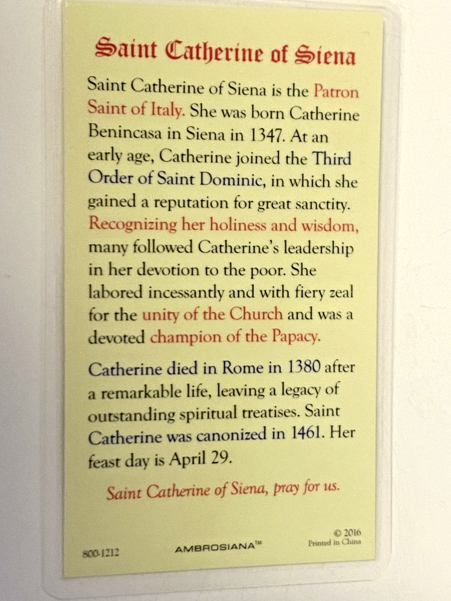 You are purchasing a laminated bio card of Saint Catherine of Siena.