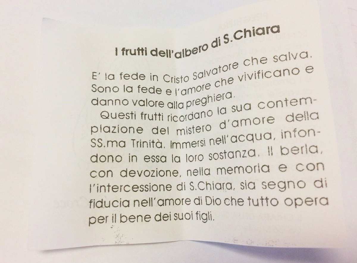 Jesus handed Clare a stick, asking her to water it. Out of obedience, telling no one of her Vision, she watered the lifeless stick. It brought and continues to bring forth blossoms and little nuts, these 700 years, from which the Nuns make rosaries as long as there are nuts available for the Nuns to make the rosaries. St. Clare is working through her Nuns and their faithfulness.
