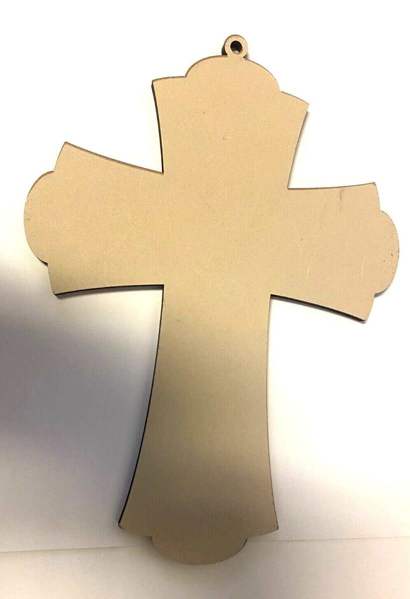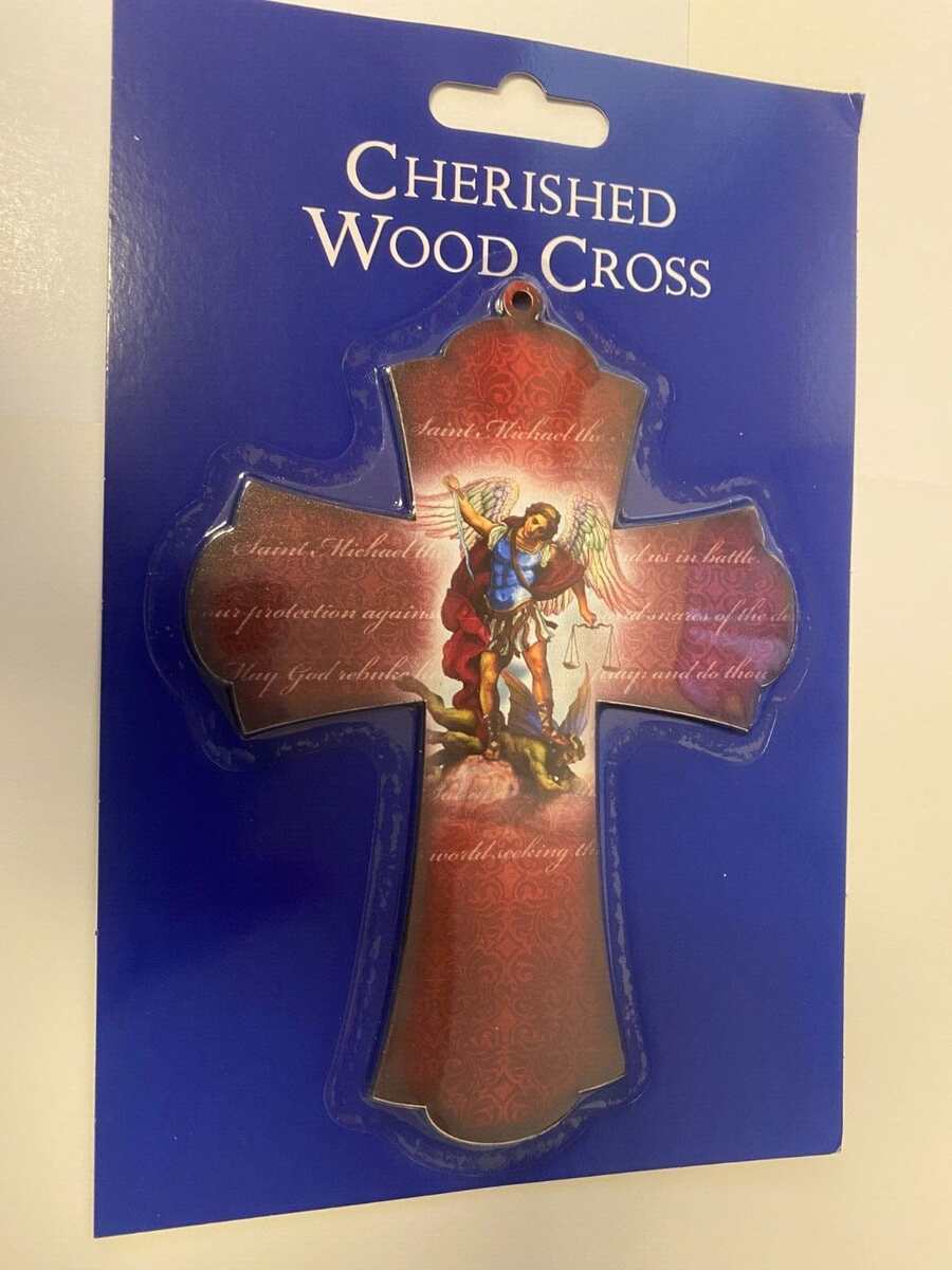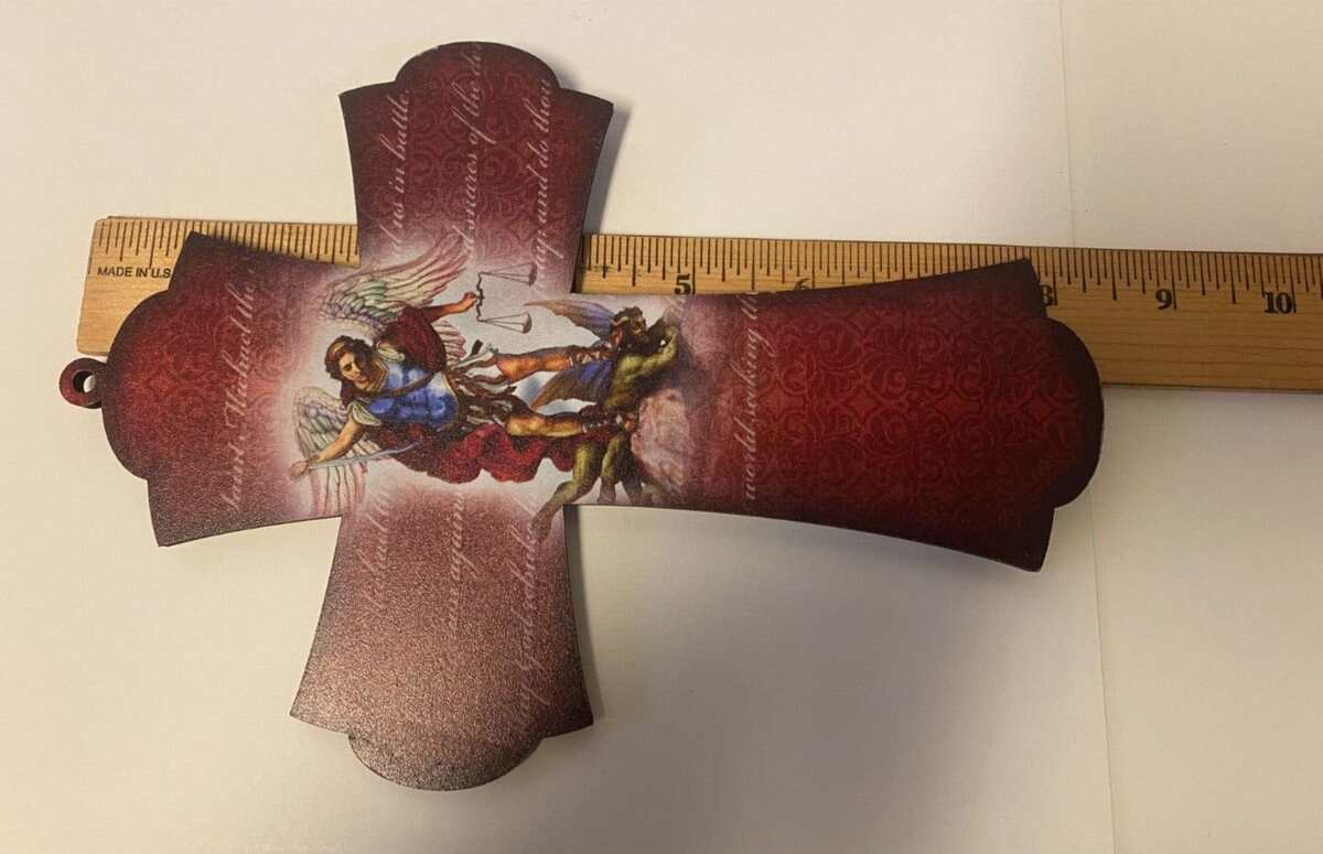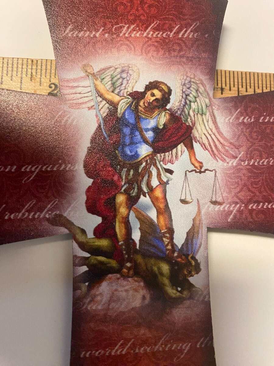 You are purchasing a beautiful colorful laser image of Saint Michael the Archangel set on thin wood cross. It measures approximately 8" h x 6" w. Bring this strong defender, Our Warrior Saint to your home as a reminder that He is always there to fight the evil and protect you. This is a perfect gift for a child's bedroom or a small space where a full size resin statue can't be placed. See pictures for details. It come in a cellophane package.