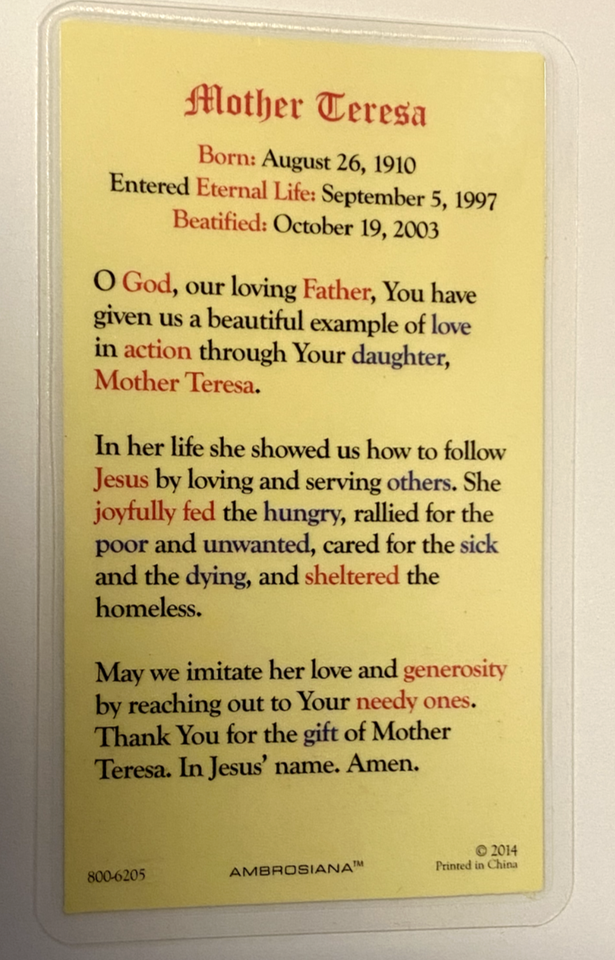 - Saint Mother Teresa of Calcutta Laminated Prayer Card, New , #PCL-25
