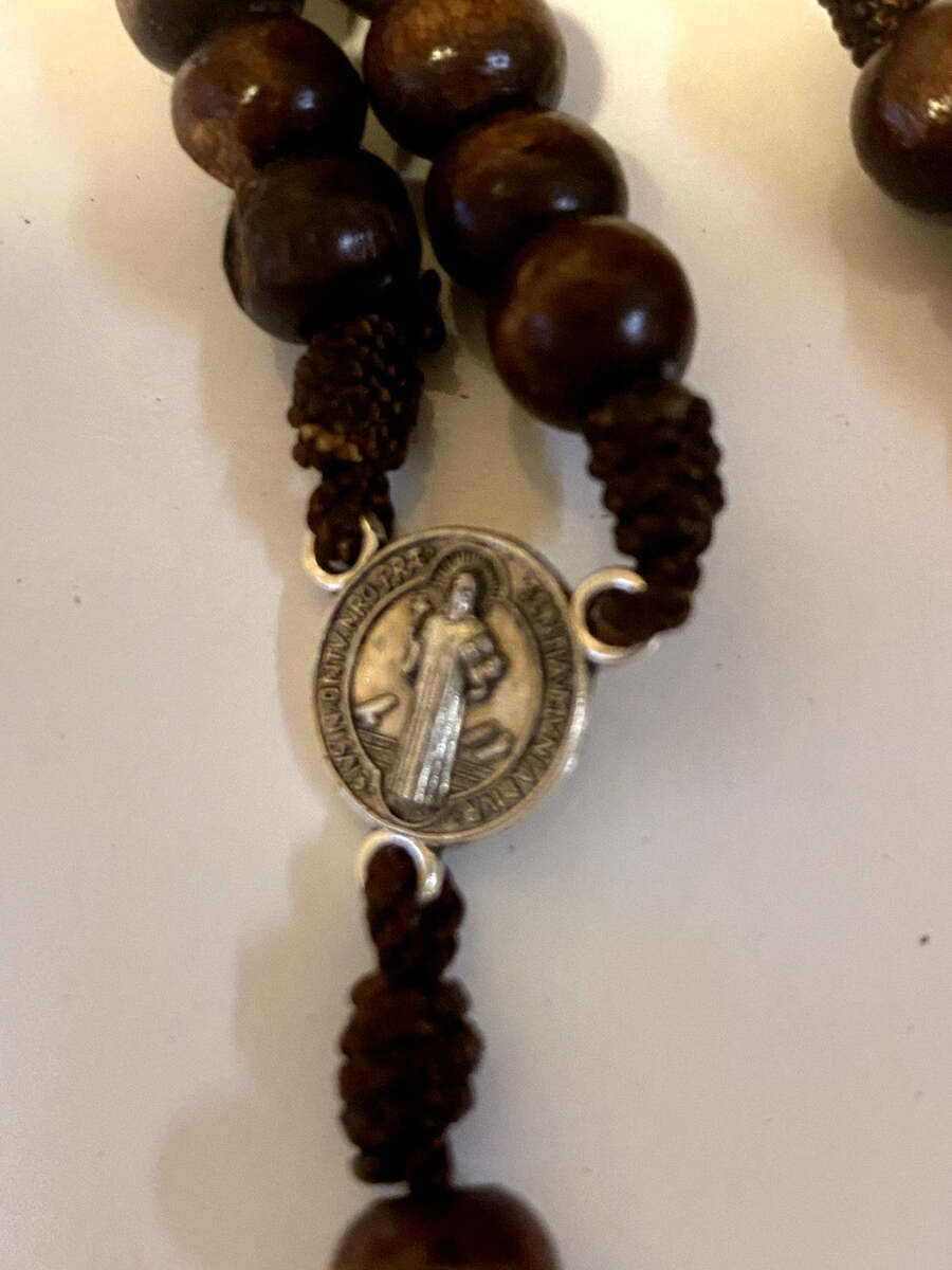 You are purchasing a beautiful wood rosary box with an acrylic image of Saint Sister Faustina Divine Mercy on top. It comes with a wood rosary with the medal of Saint Benedict.