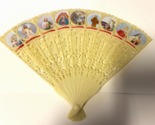 You are purchasing a small fan that contains several images on the saints. It's made of Celluloid, it measures approximately 8.75" when open and length is 6.50".