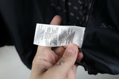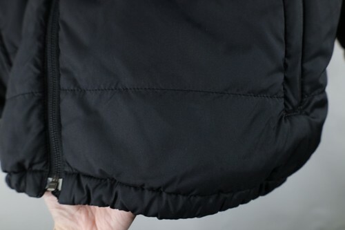 Loose threads front. Hole back top. Dark spots front, arms, back. Trim on hood/cuffs discolored, pilled. Color, graphics faded