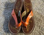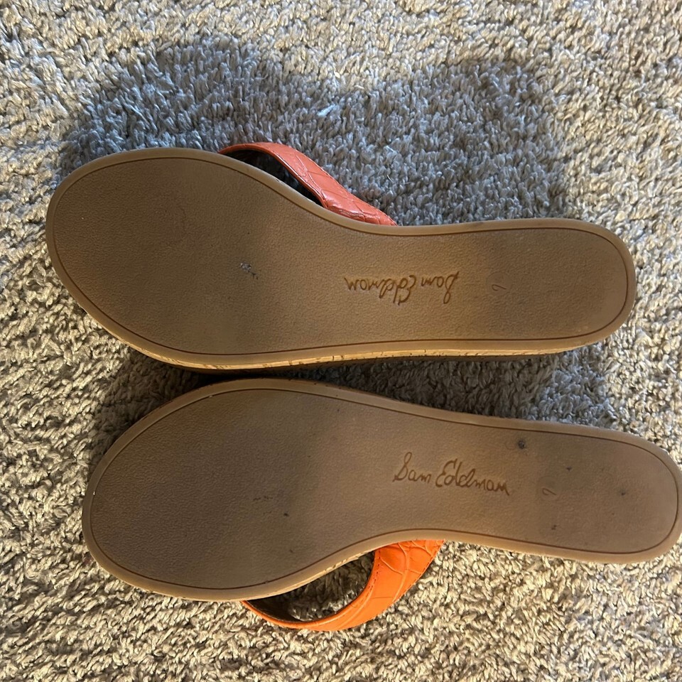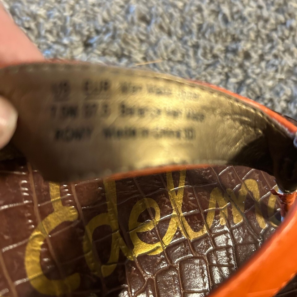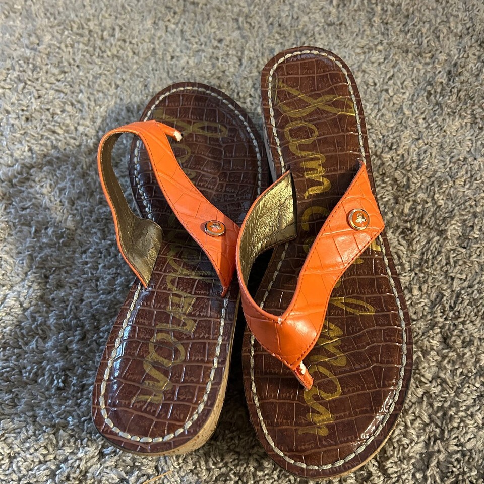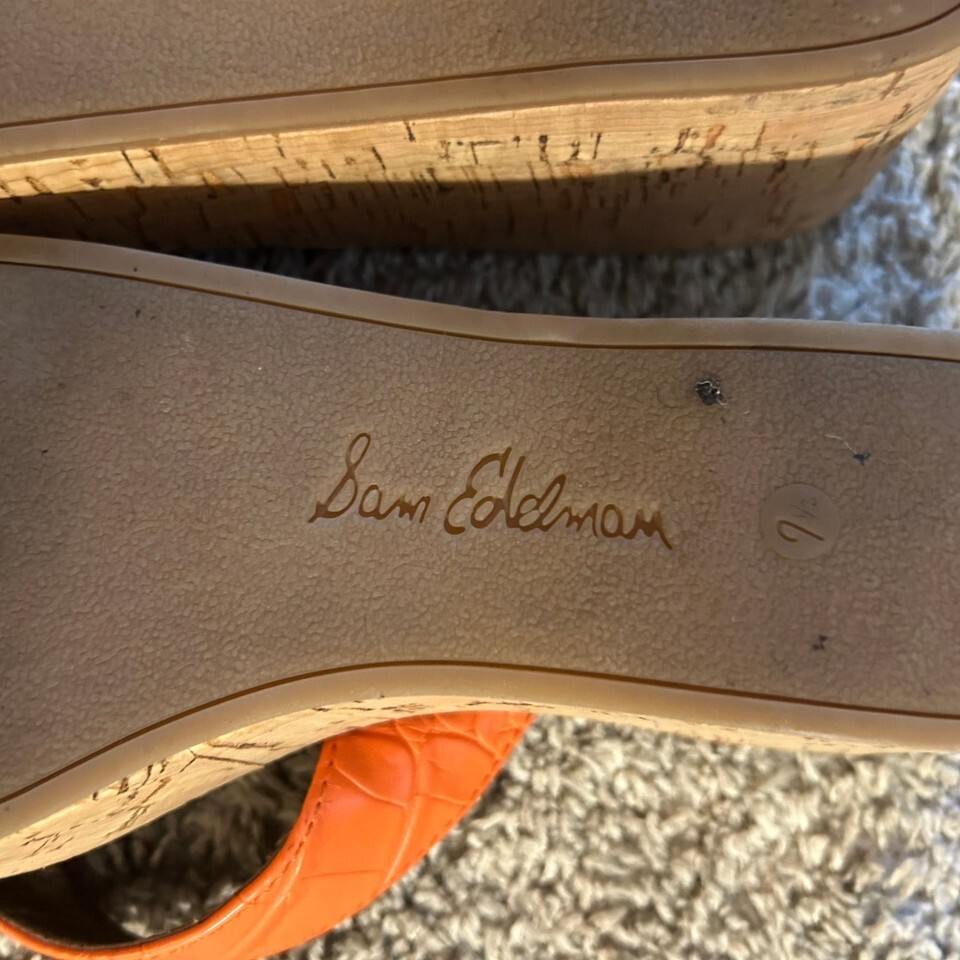 Step out in style with these Sam Edelman Romy wedge platform thong sandals. Featuring a chic patent crocodile embossed footbed and vibrant orange, croc-embossed straps, these sandals are perfect for adding a pop of color to any outfit. The comfortable cork wedge provides elevation while maintaining stability. These sandals are in excellent pre-owned condition, The Romy style is well-loved for its comfortable fit and trendy design, making these a valuable addition to your warm-weather wardrobe. Made in China.