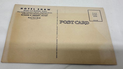 This vintage postcard features a stunning view of Hotel Shaw in San Francisco, California. The postcard is an original printed lithograph that showcases the beauty of the city and its iconic landmarks. The postcard is unposted and is a single unit, making it a great addition to any collection.