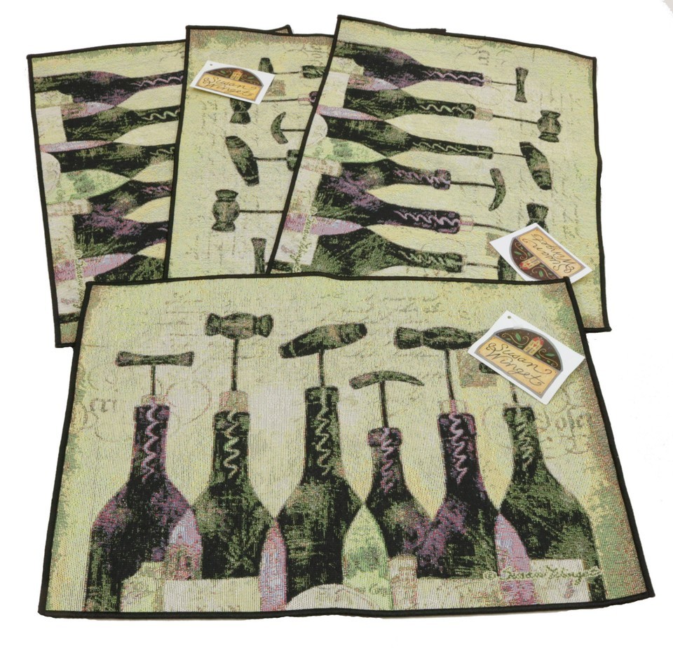 You'll be all set for a party or wine tasting with these unique place mats designed by Susan Winget. These place mats have multiple wine bottles in varying shades of purple, green and black. Each bottle is topped off with a different wine bottle opener, just waiting for you to pull the cork! The background is in shades of light green and yellow with a hint of red. The place mats are backed in black and are hemmed in black. Made in the USA Tapestry Made in USA Made in the USA by manual woodworkers and weavers Set of 4 Place Mats 55% Cotton 45% polyester machine wash cold water gentle cycle, no bleach, tumble dry