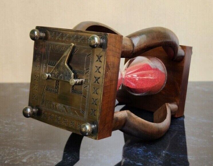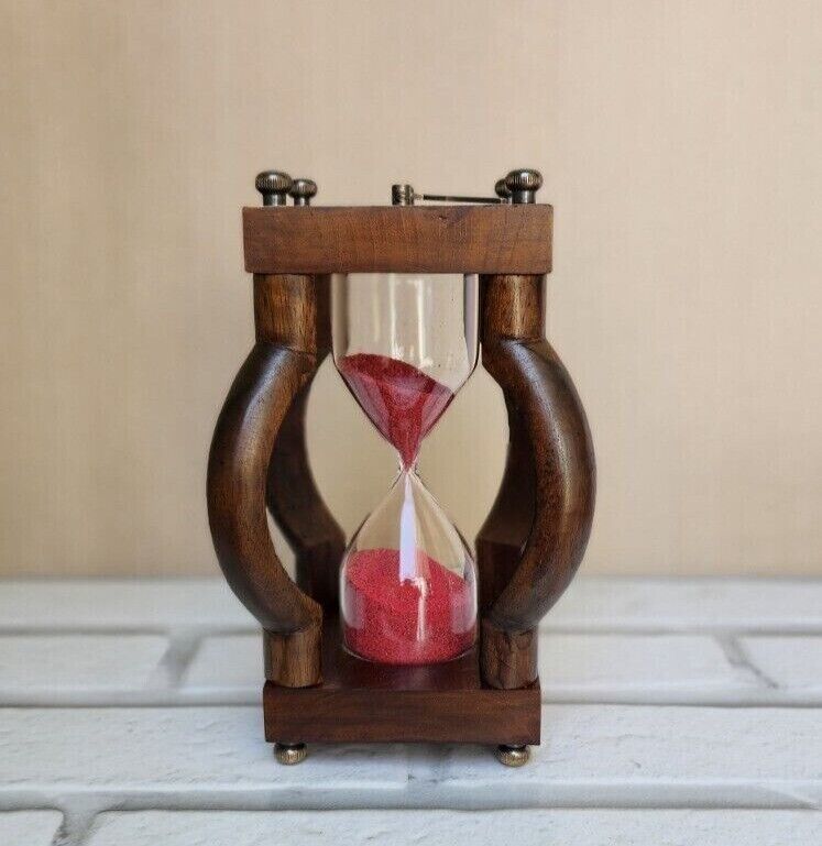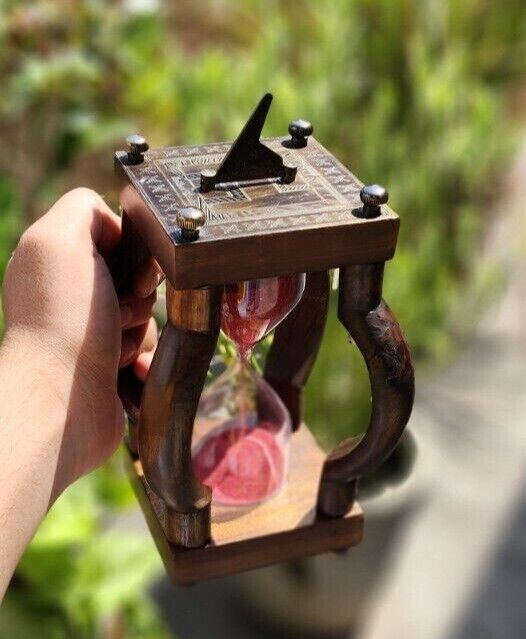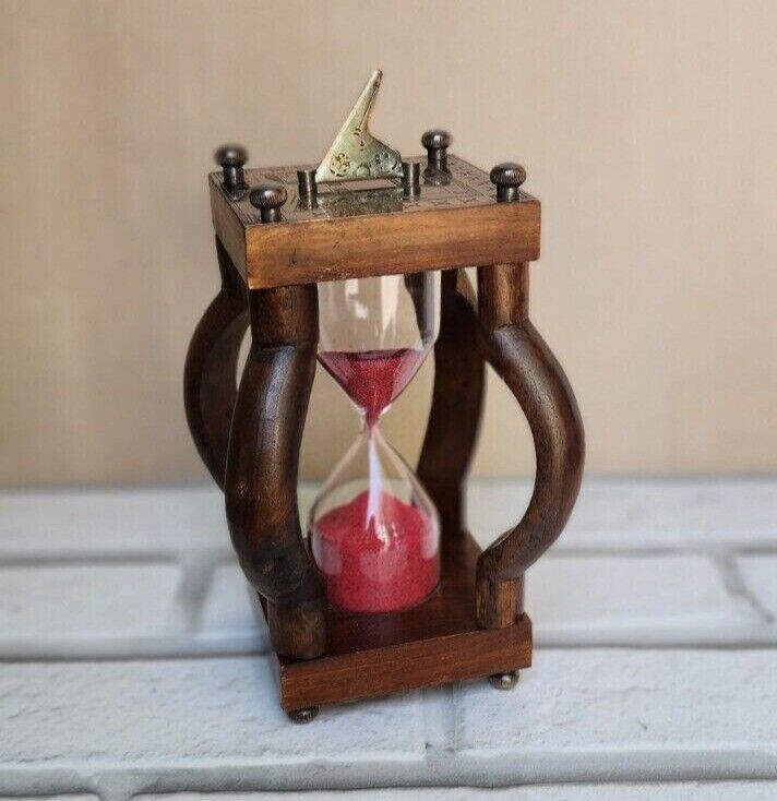 Vintage Brass Sand Timer with Compass on Wooden Base Hour Glass Clock Nautical Theme Decor (5 Minute, Pink Sand, Wooden base, Transparent Glass Bulb). This is a reproduction of Vintage Sand timers with Sundial Cock. This is new and unused sand timer .It has two connected vertical glass bulbs allowing a regulated flow of sand from the top to the bottom. Once the top bulb is empty, it can be inverted to begin timing again. The time of the sand timer is already set. It will run as per our description time limit.