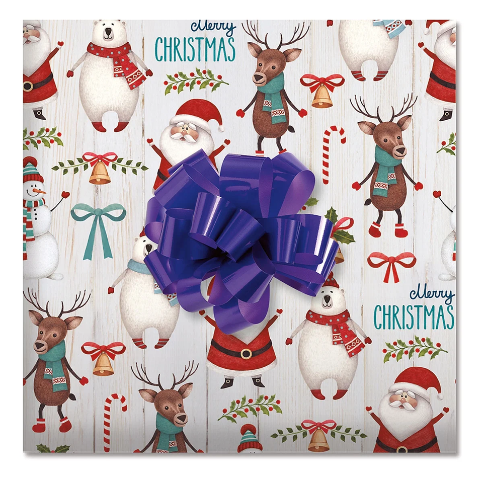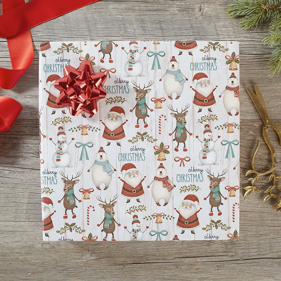 Jumbo roll: 61 Square foot Wrapping Paper Roll of Christmas gift wrap, 23 inches by 32 feet long. Festive design: Wishing you a Merry Christmas with festive polar bears, reindeer and Santa Claus on a clean background. Boutique quality: Made of heavyweight, sturdy, peek-proof paper creases beautifully, ideal for holiday gift wrapping. No creases: Comes in roll form for smooth unrolling and wrapping. No folds mean no creases which is ideal for holiday gift wrapping.