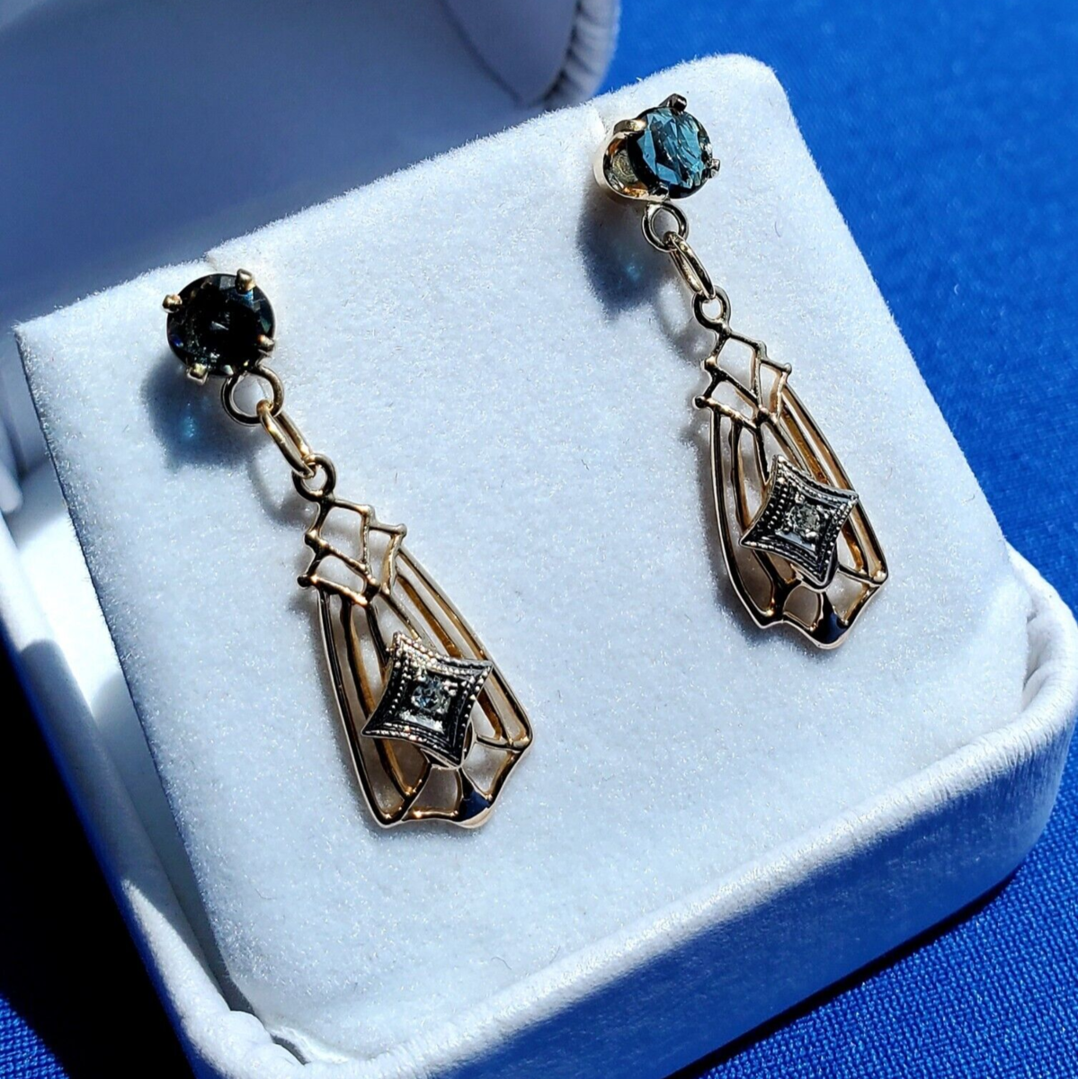 - Sapphire Diamond Deco Earrings Gatsby era Vintage Filigree Dangles 14k Gold