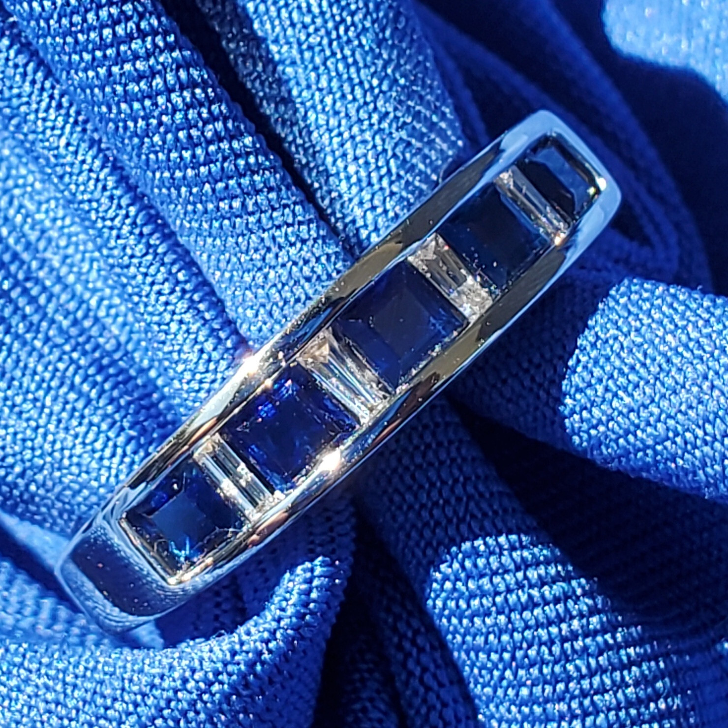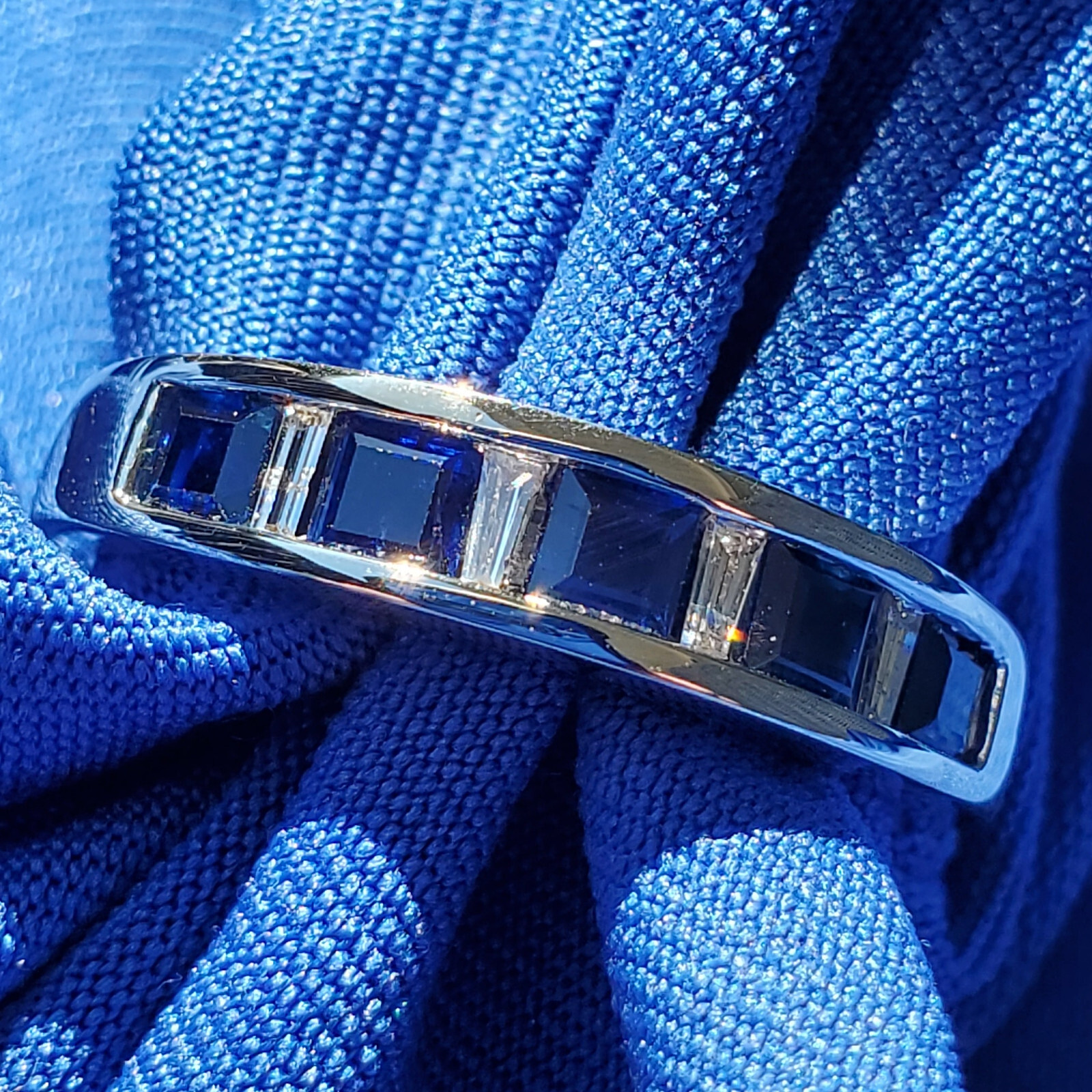 SAPPHIRE DIAMOND WHITE GOLD STATEMENT WEDDING BAND.