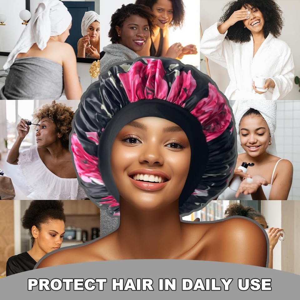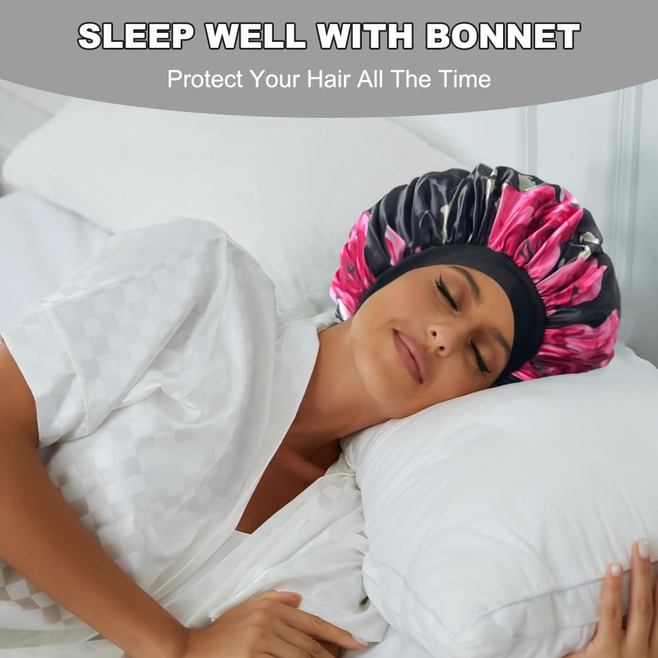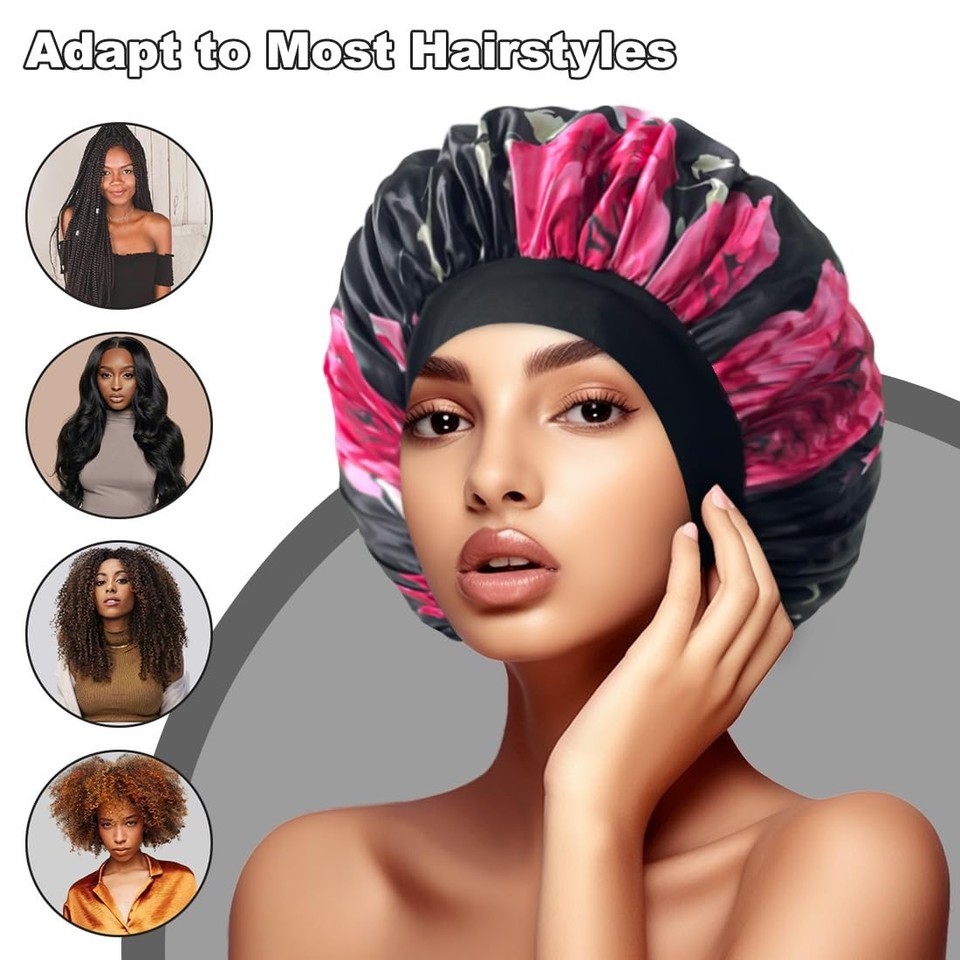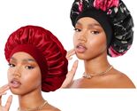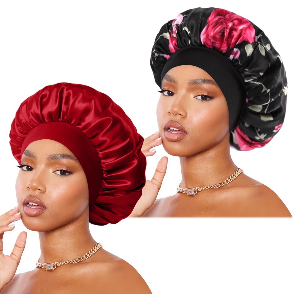 Satin Bonnet 2 Pack Silk Hair Bonnets Black Peacock Blue Pink