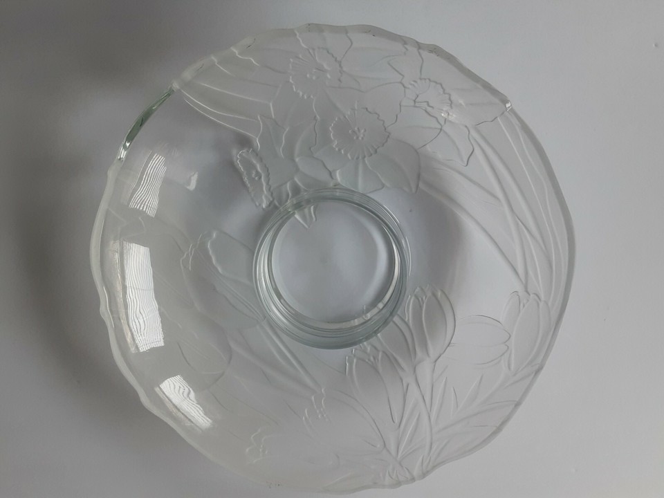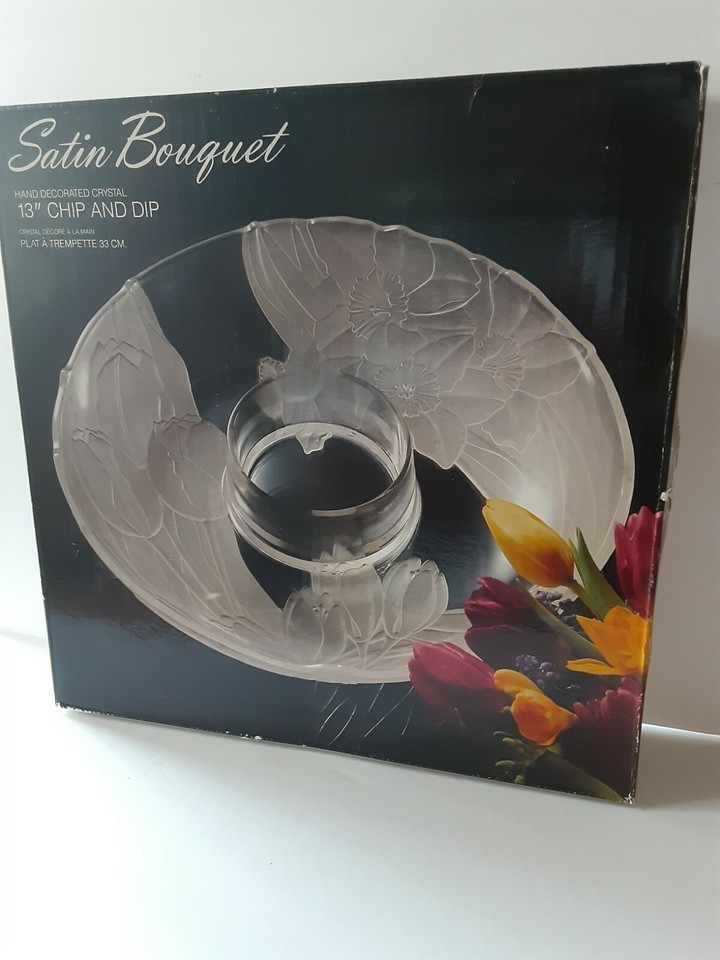 Satin Bouquet glass bowl perfect for chip and dip. Great for serving your best chip and dip during the football season or any other occasion. This beautifully crafted glass bowl will add unique and elegant look to your dinning room collections.