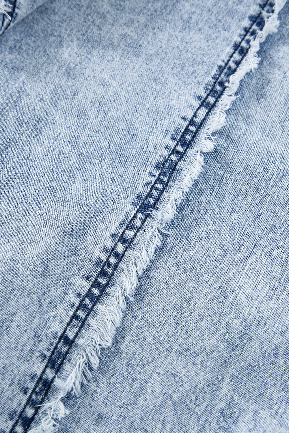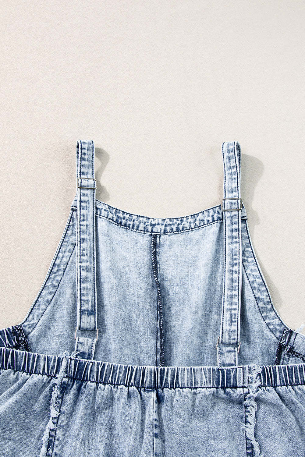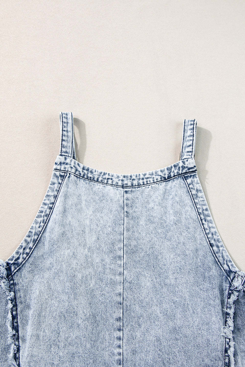 This denim overall is perfect for those who love vintage fashion with a modern twist. The light wash adds a touch of nostalgia, while the frayed exposed seam adds a fun and eye-catching element. With its sleeveless design and wide leg fit, this overall pairs effortlessly with any stylish top, making you feel both slender and taller.