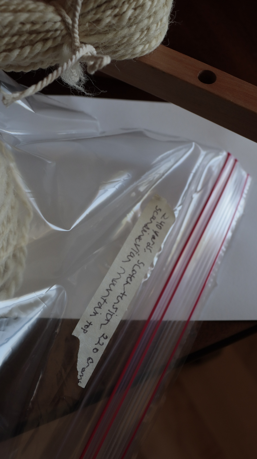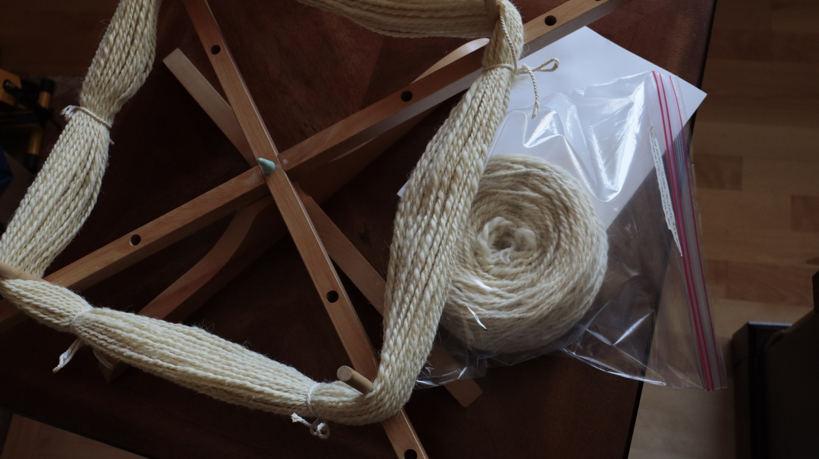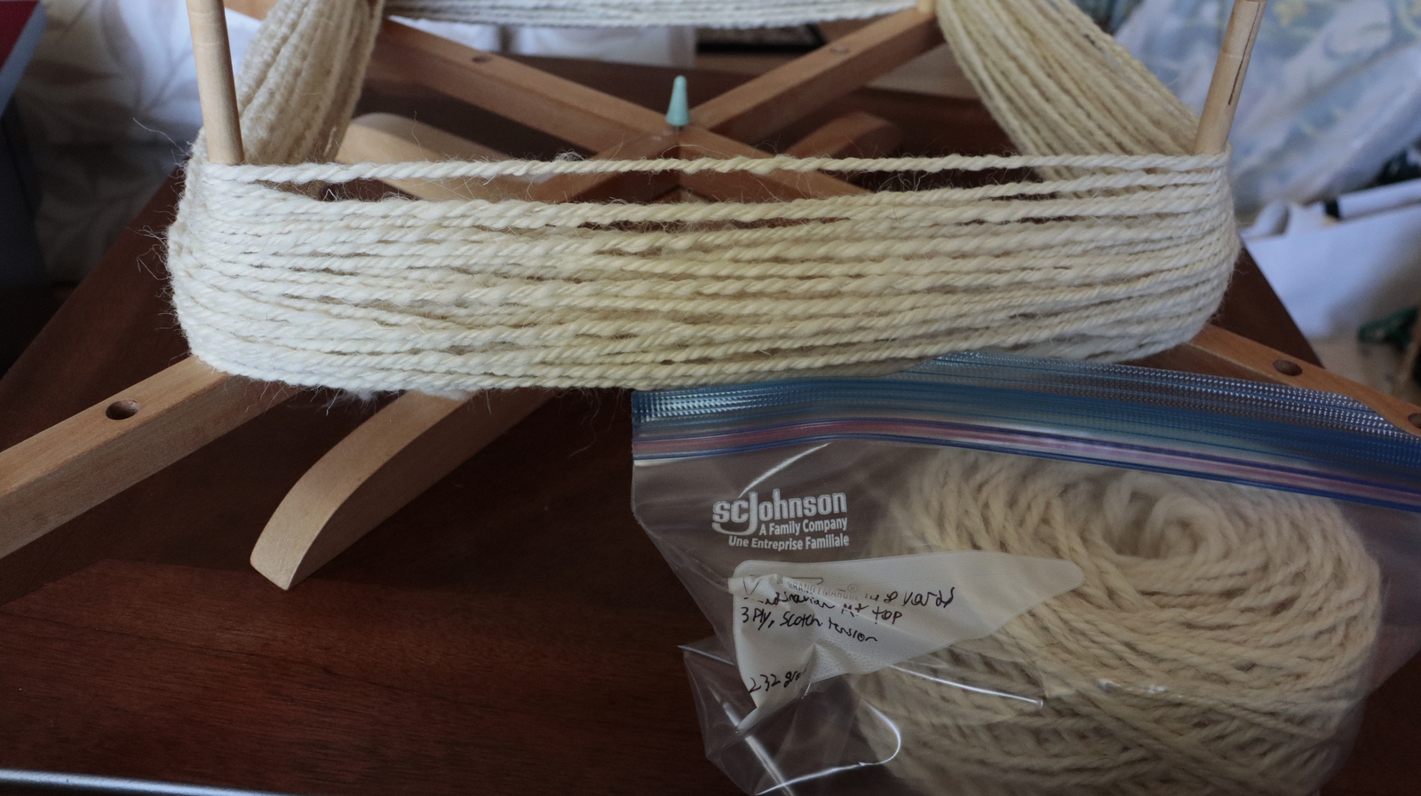 Spun form the off-white wool of one of the coldest breeds of sheep on Earth, this yarn is very springy. Spun double-drive.