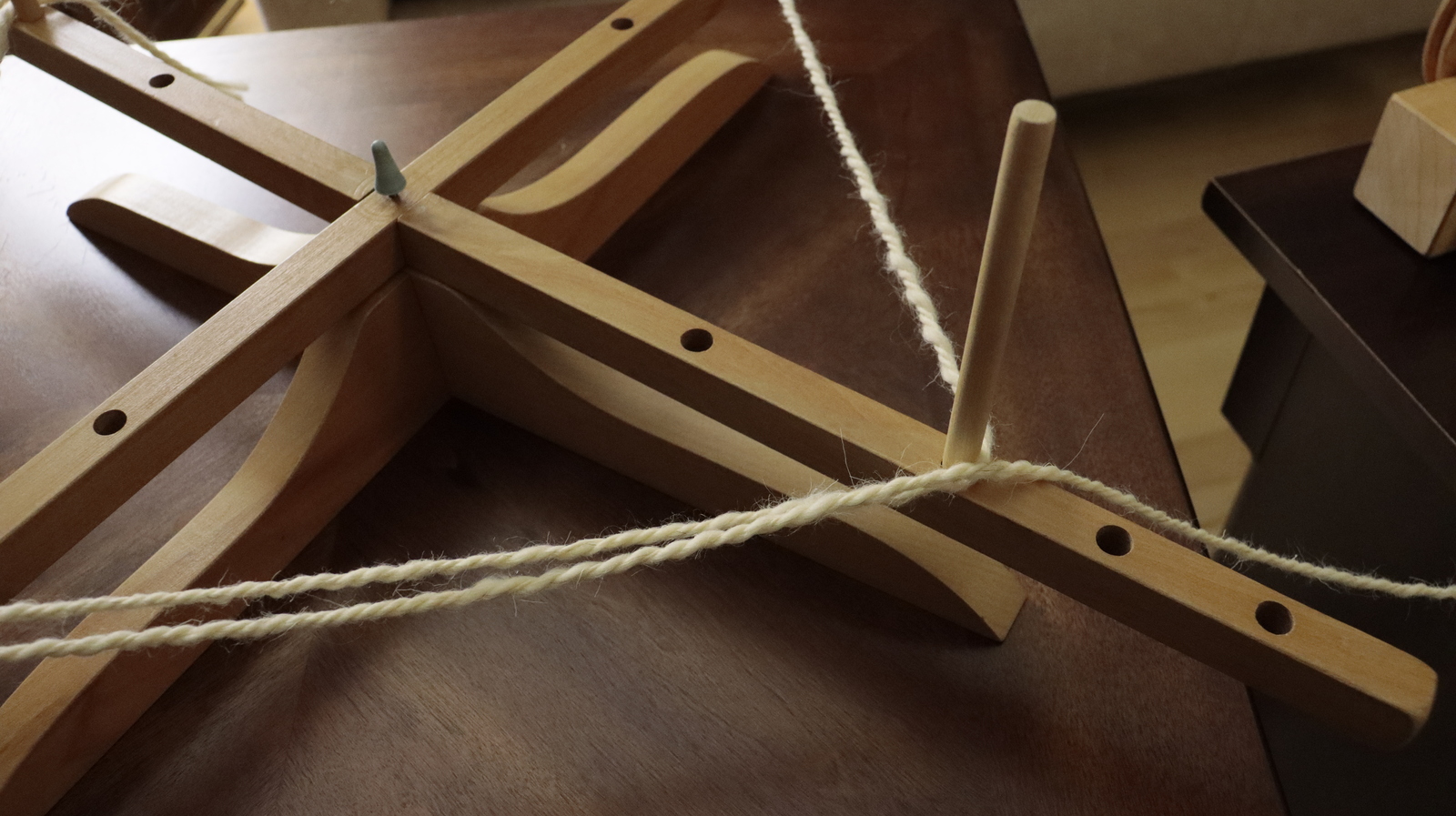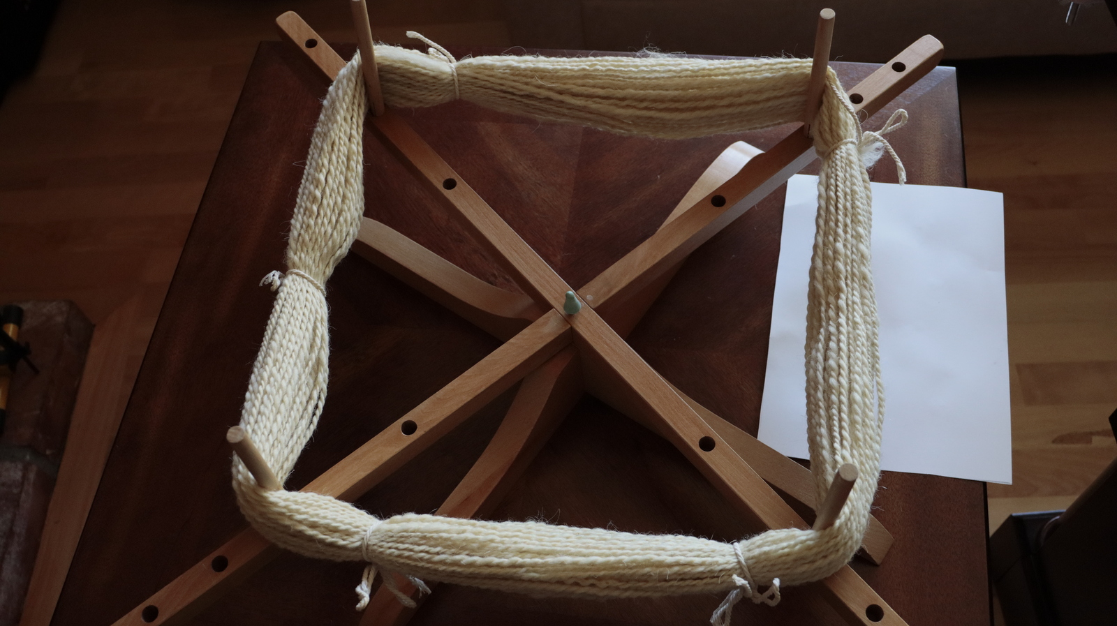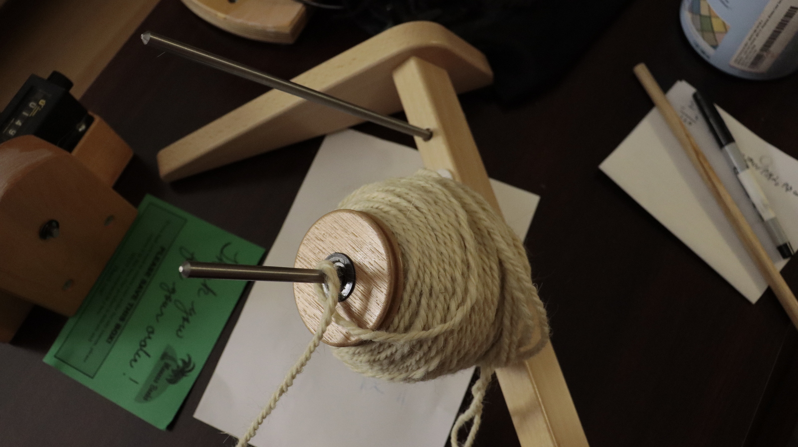 Spun form the off-white wool of one of the coldest breeds of sheep on Earth, this yarn is very springy. Spun double-drive.