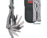 INCLUDES: Needle nose pliers, regular pliers, vise, wire cutter, cap lifter, can opener, locking phillips screwdriver, scribe, awl, leather bore, locking dual edge knife blade, metal file