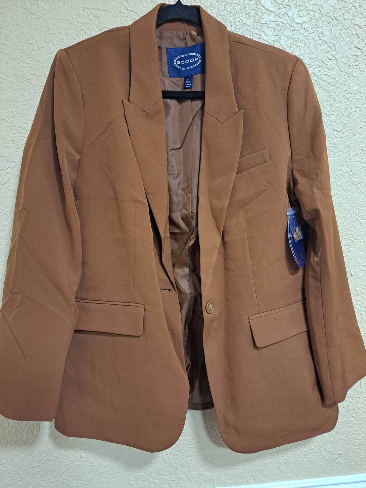 This Scoop Women's and Women's Plus Crepe One-Button Suit Blazer in size XL (16-18) offers a sleek, polished look with comfortable wear. Made from a high-quality crepe fabric blend of 89% polyester and 11% spandex, it provides a touch of stretch for ease of movement while maintaining a tailored silhouette. The blazer features a classic one-button front closure, sharp peak lapel collar, and two front welt pockets. Itโs fully lined with 100% polyester for a smooth, professional finish. Designed with a slightly relaxed fit, it still flatters the waistline and works well dressed up or down. The length is approximately 30 inches from shoulder to hem, making it suitable for layering over both tops and dresses. Easy to care for and machine washable, this blazer is a versatile wardrobe stapleโperfect for work, events, or elevating everyday outfits.