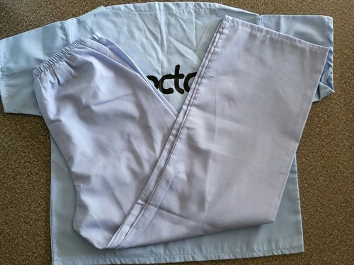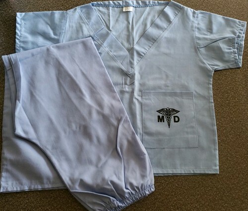 This sale is for a Child's Size 8 Scrub Set Scrub top measures approximately 16.5" armpit to armpit Scrub top measures approximately 17" from back of collar to hem Scrub bottoms measure approximately 29.5" from waist to hem Inseam measures approximately 20" Light blue in color Short sleeve 50% Polyester 50% Cotton Scrubs say "Doctor In Training" on back of top Scrub bottoms have an elastic waistband Scrubs are brand new never worn Please view photos for a good description of this scrub set Thank you!