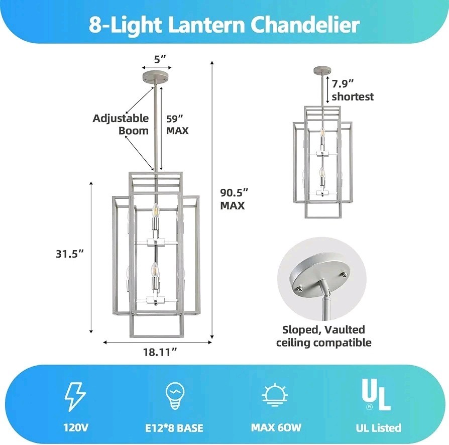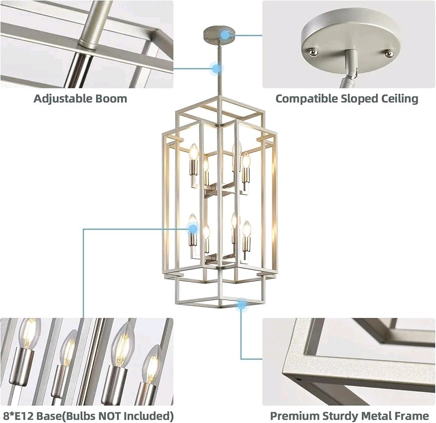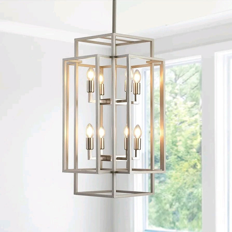 The Sliver Foyer Chandelier by Sdorens is a modern and elegant farmhouse lantern chandelier designed for high ceilings. This 8-light chandelier features a sleek silver color and a height of 31.5 inches when fully extended, making it a stunning statement piece for any home or space. With its stylish design and large size, this chandelier is sure to add a touch of sophistication to any room.