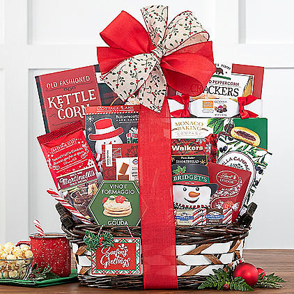 Capture the spirit of the season with this gift basket of crowd-pleasing holiday favorites. With Ghirardelli milk and dark chocolate peppermint bark, kettle corn, cracked peppercorn crackers, smoked gouda cheese spread, Lily O'Brien's sticky toffee - sweet smooth caramel smothered in milk and dark chocolate, spiced waffle cookies, Godiva and Lindt milk chocolate truffles, chocolate cream cookies, fruit and nut bites, olives, a milk chocolate biscuit bar and organic mulling spices, there's something for everyone in this fun, festive gift basket.