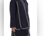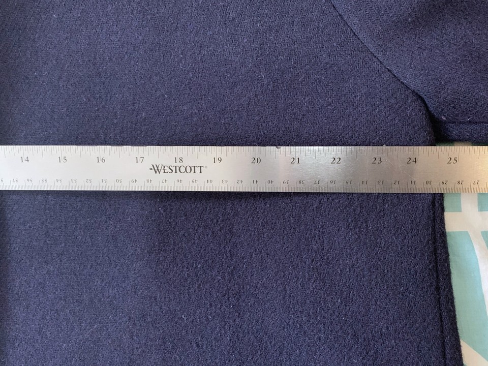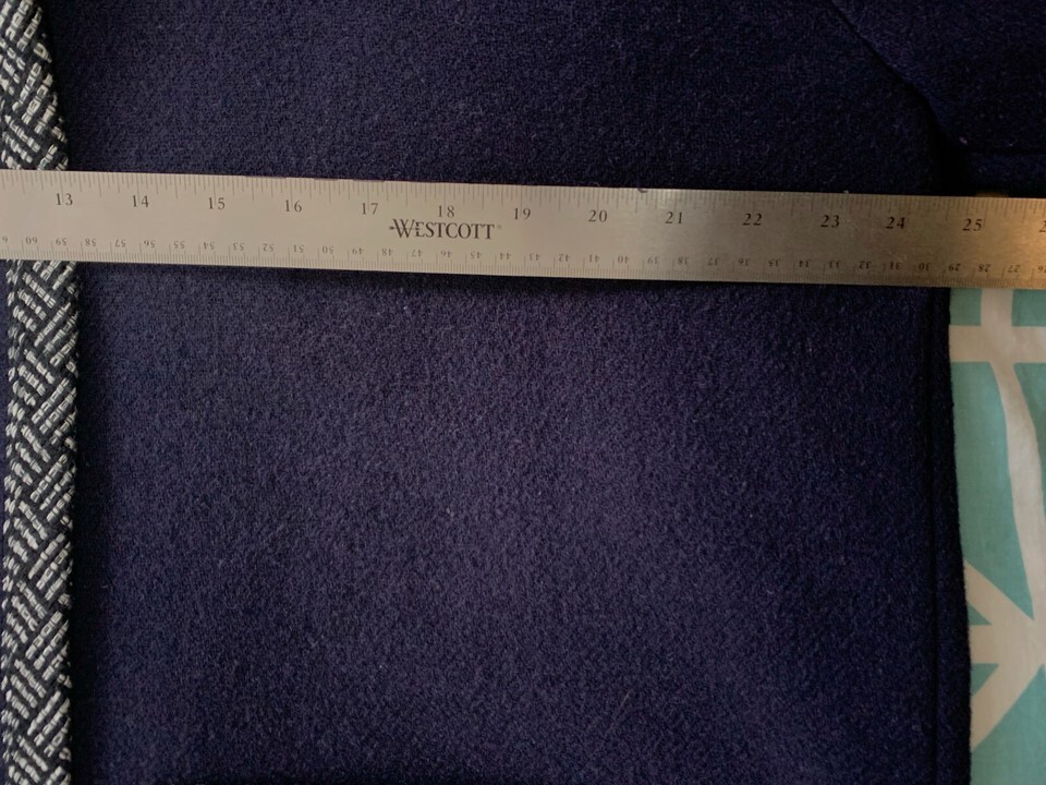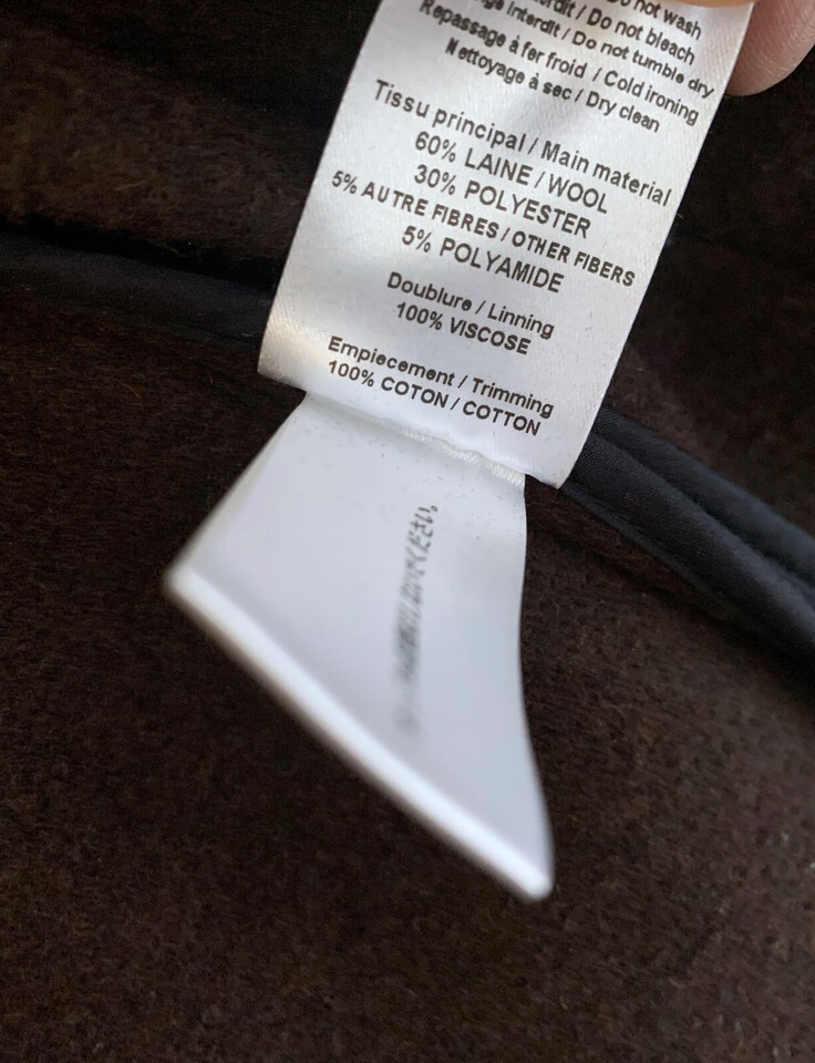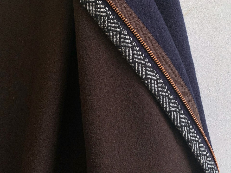 Fairly heavy wool but roomy and perfect for layering. Wool hood and contrasting built-in scarf are snap-off removable. Quality copper zipper at front and matching copper hood snaps, front drop patch pockets, no interior pockets.