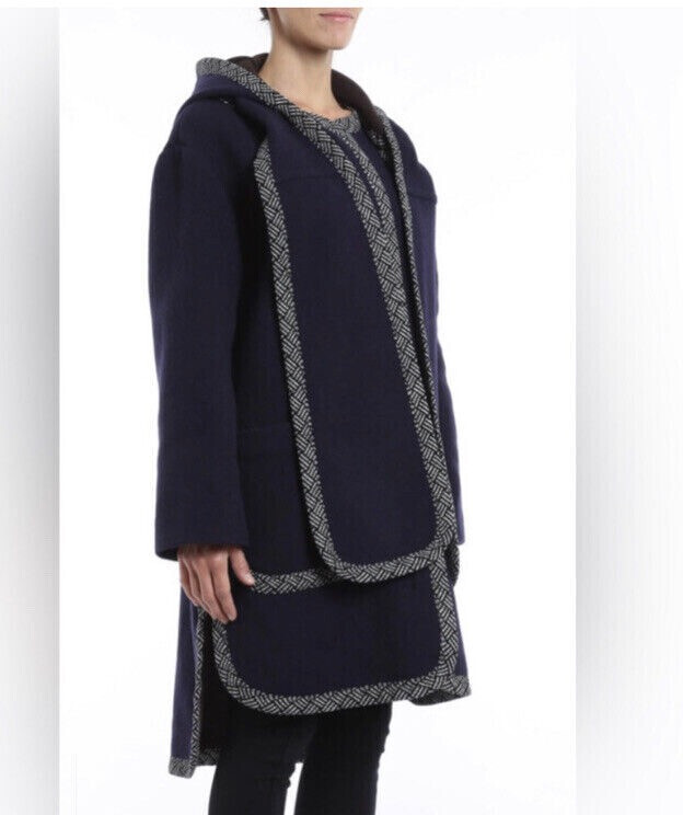 See by Chloe Indigo Hooded Wool Double-Face Long Zip Coat with Patterned Trim 44
