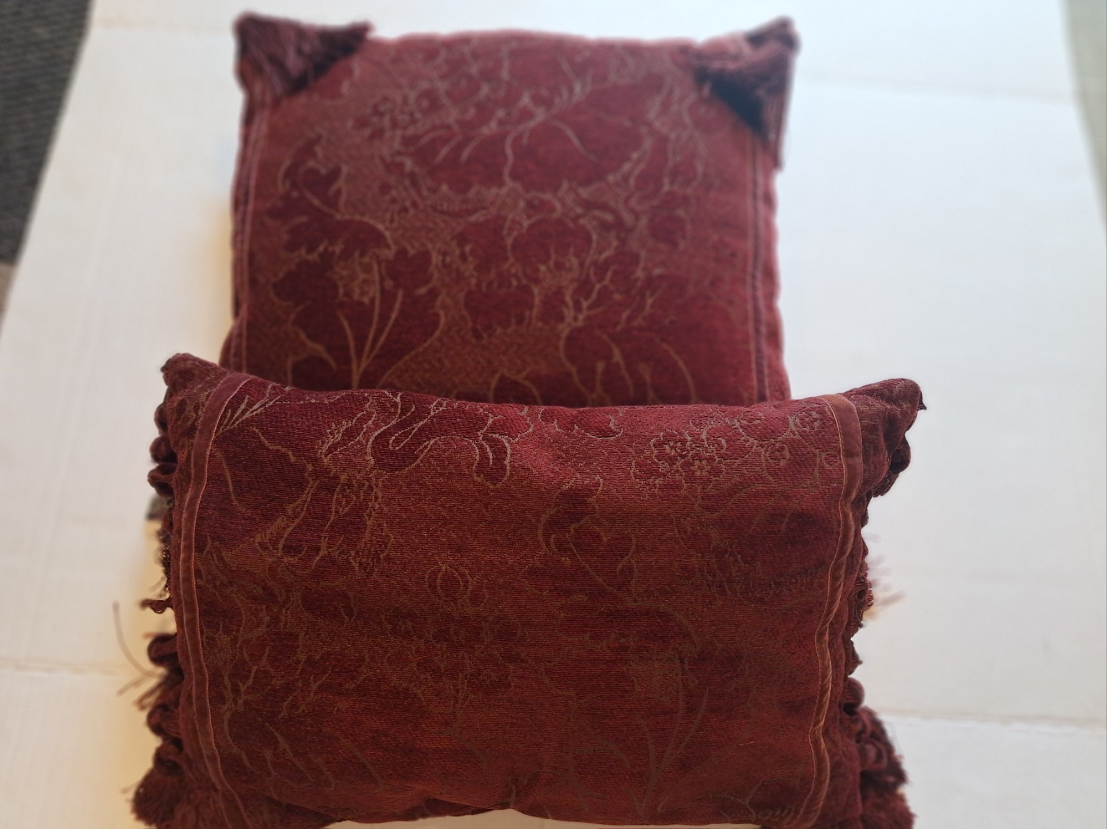 Set of 2 Borgata burgundy tapestry throw pillows. One 17"17" and one 17"12". The larger one looks like a seam has been repaired. The smaller one is missing 3 tassels on the same side. See pictures. Overall both in decent condition