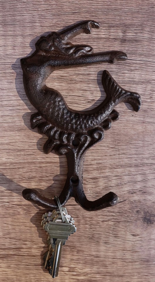 ? This cast iron mermaid 2 prongs wall hook is the perfect addition to any beach themed home. Easy decorative mounting, ideal for hanging clothes, keys, leashes and accessories. Display this decorative wall hook to add a beach theme to any room and show those who visit your home your affinity for the sea life lifestyle.
