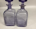 Set Of 2 Purple Lavender Glass Ship Decanters Apothecary Jars W/ Stoppers. In used condition. The stoppers have some chips around the edges from age and use. These jars measure 8?H. They are a slightly different style. One is more like a square while the other is more rounded.