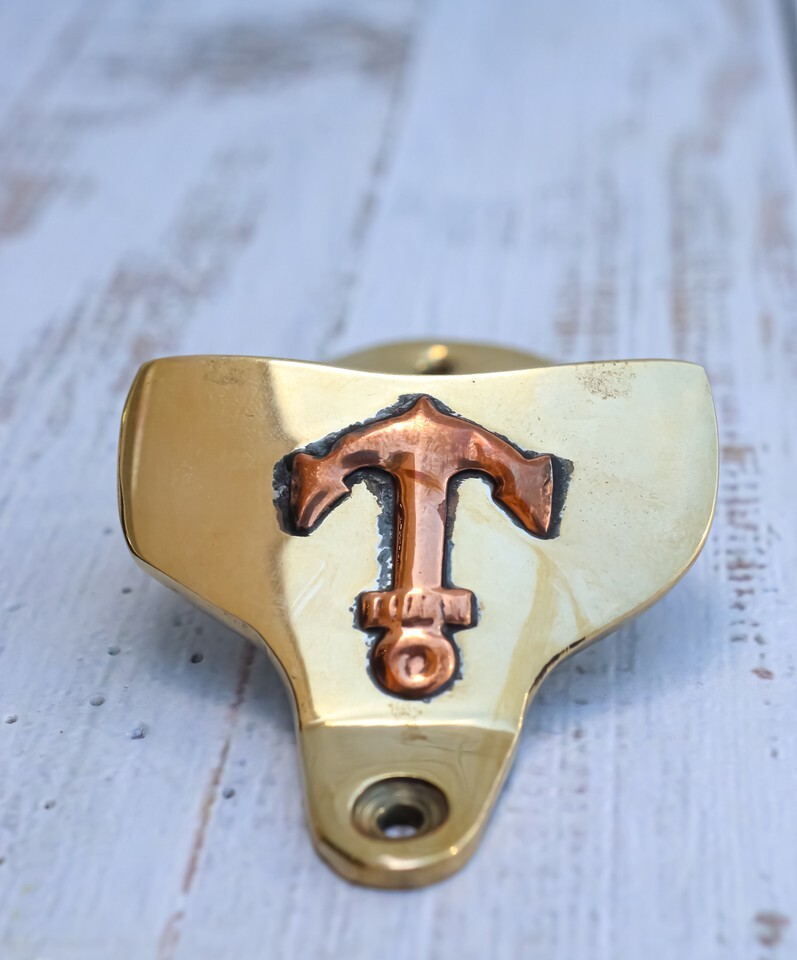 ? This Nautical Ship Anchor Wall Bottle Opener is made of brass, finished in gold lustre. please be sure to anchor the screw for mounting if you are mounting the bottle opener against your sheet rock wall.