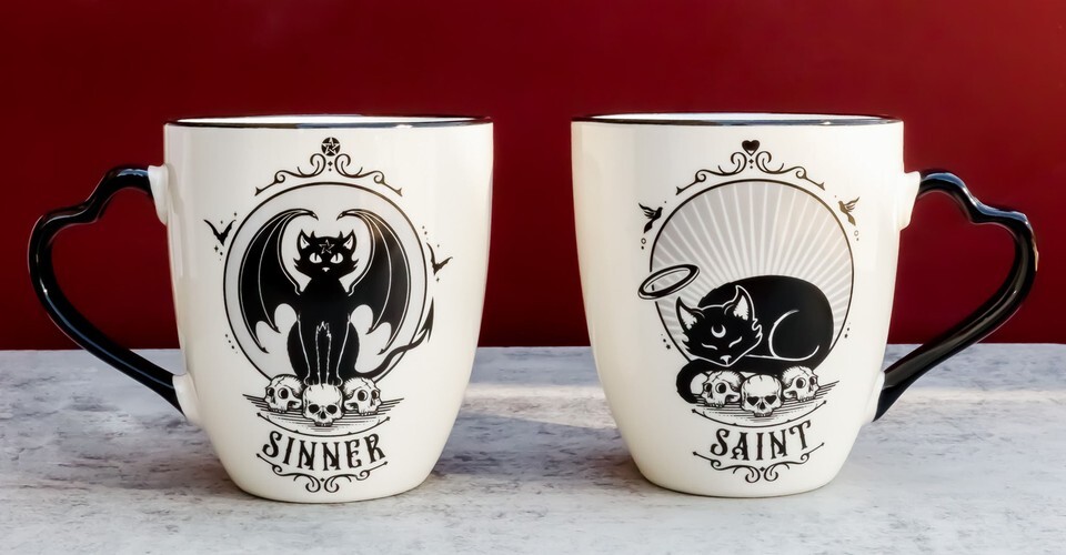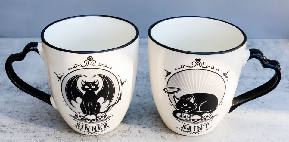? Saint or Sinner! You choose! These double sided couple mugs mean you can show your other half just how you're feeling! Featuring unique Alchemy art work on both sides of the mug. One side is saint cat and on the other side is sinner cat! One day a sinner, turn the mug around and the next time your use your mug, you are a saint!! These mugs are perfect for however you're feeling!