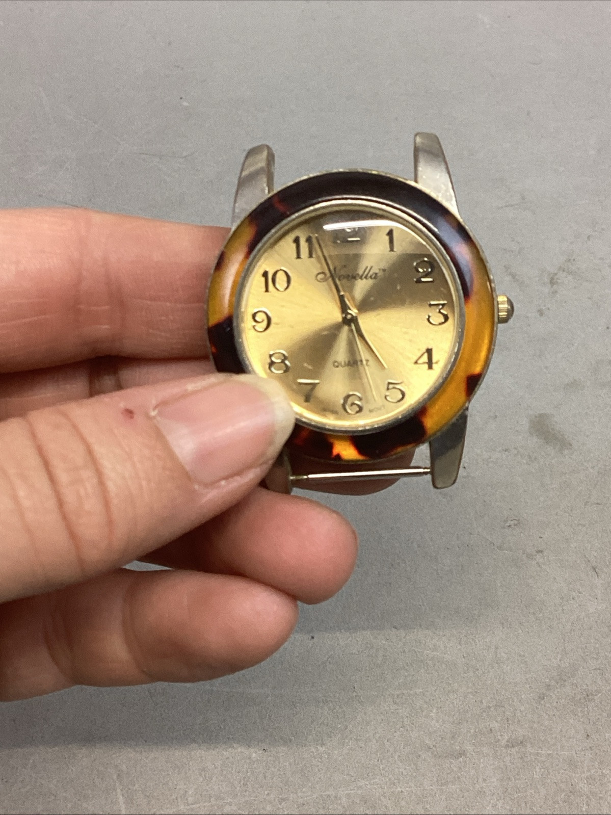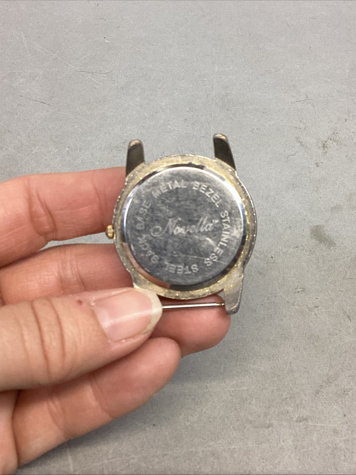 3. Novella. No watch band included. Just the watch face. The face is scratched in a few spots which is hard to tell in the pictures. Looks good otherwise. Untested.