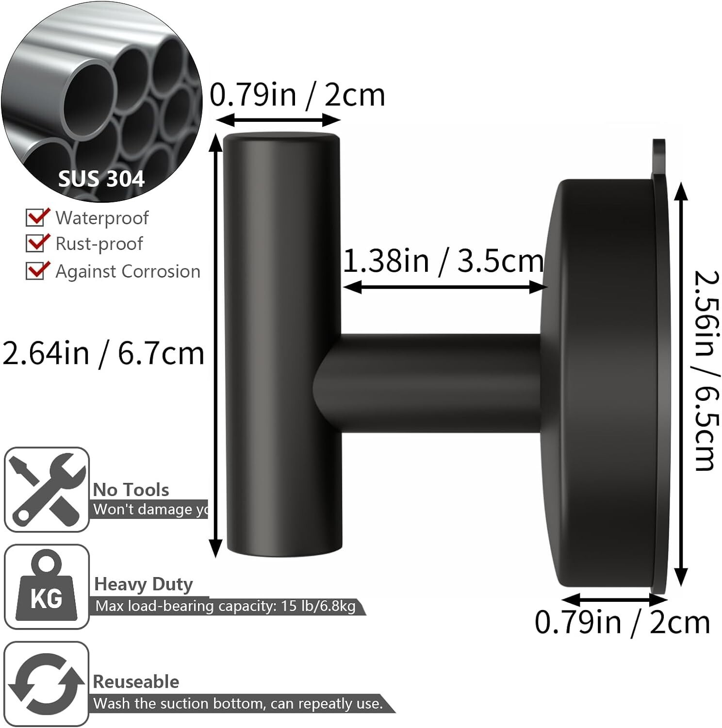 Upgrade your bathroom with our modern matte black towel hook, expertly designed to combine style and functionality. Made from 304 stainless steel with a waterproof and rust-proof finish, this sleek hook fits seamlessly into any bathroom decor. Its innovative suction cup design allows for easy, damage-free installation on smooth, non-porous surfaces like glass, tiles, or mirrors?perfect for bathrooms, kitchens, and laundry rooms. Capable of supporting up to 15 pounds, it?s perfect for towels, robes, umbrellas, or clothing. Reusable and easy to reposition, this versatile hook is a stylish and practical addition to your home.
