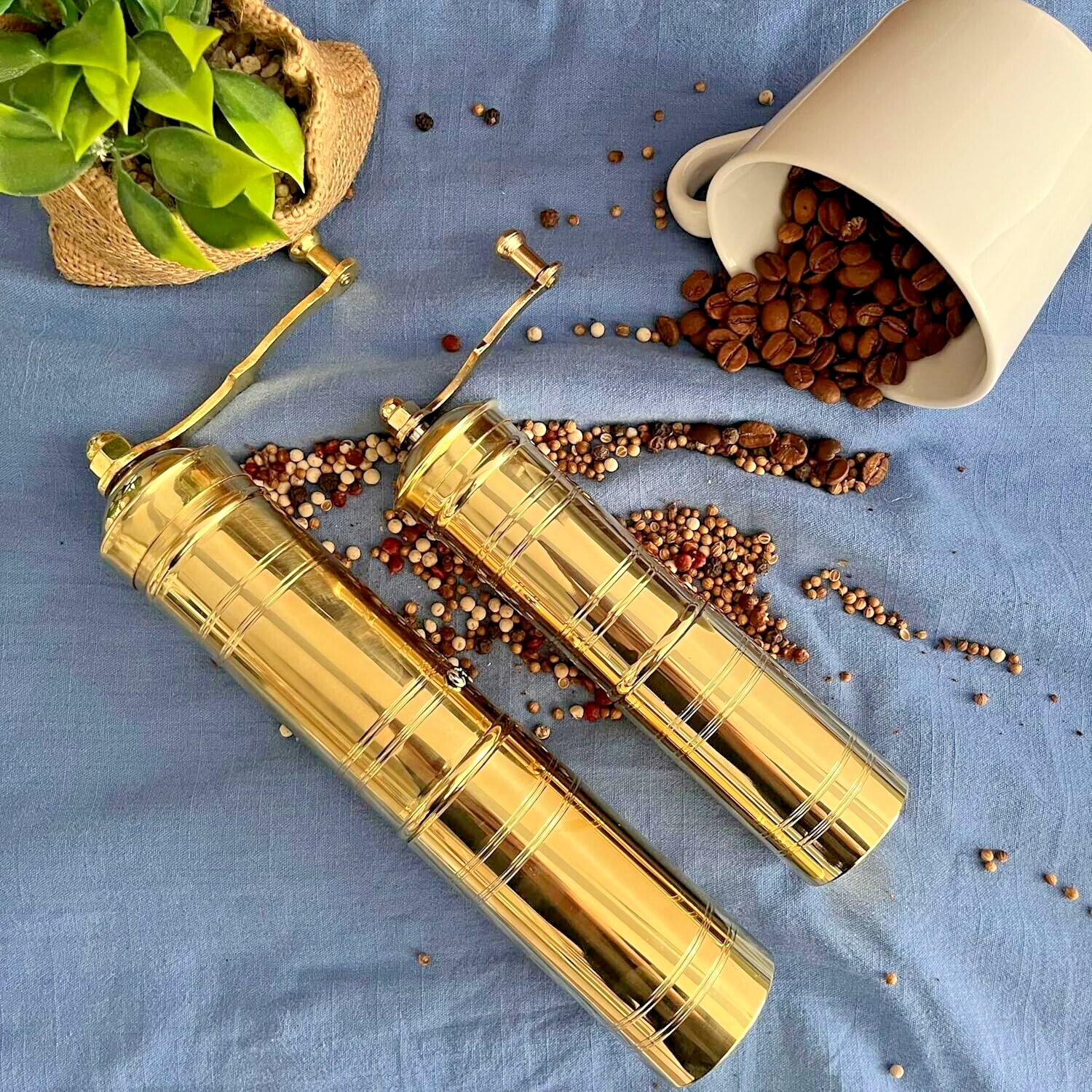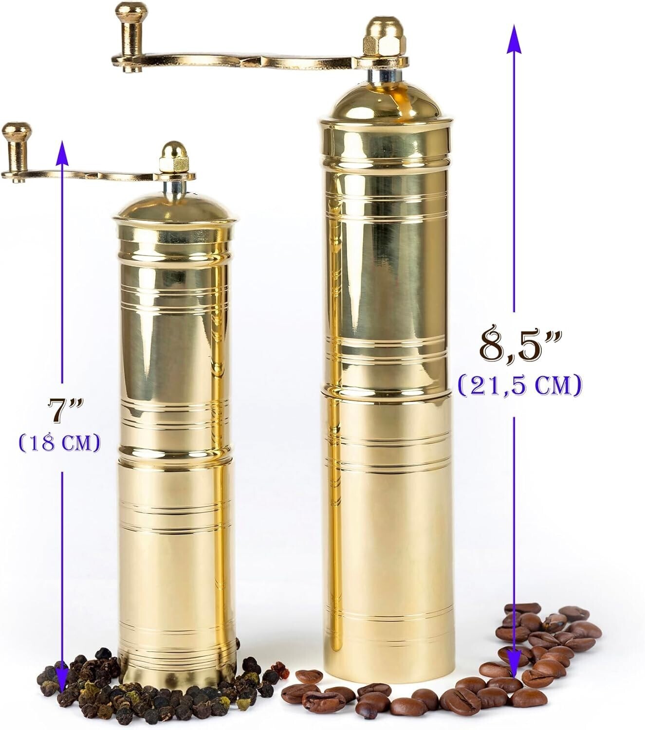 ? Crafted for durability and style: Made with high-quality brass, bigger grinder stands tall at 22 cm (8.7 inches) and measures 4.5 cm (1.8 inches) in width. Smaller Grinder is 7" (18 cm) height. Their sturdy construction ensures lasting performance while exuding an elegant, vintage charm in your kitchen or on your countertop.