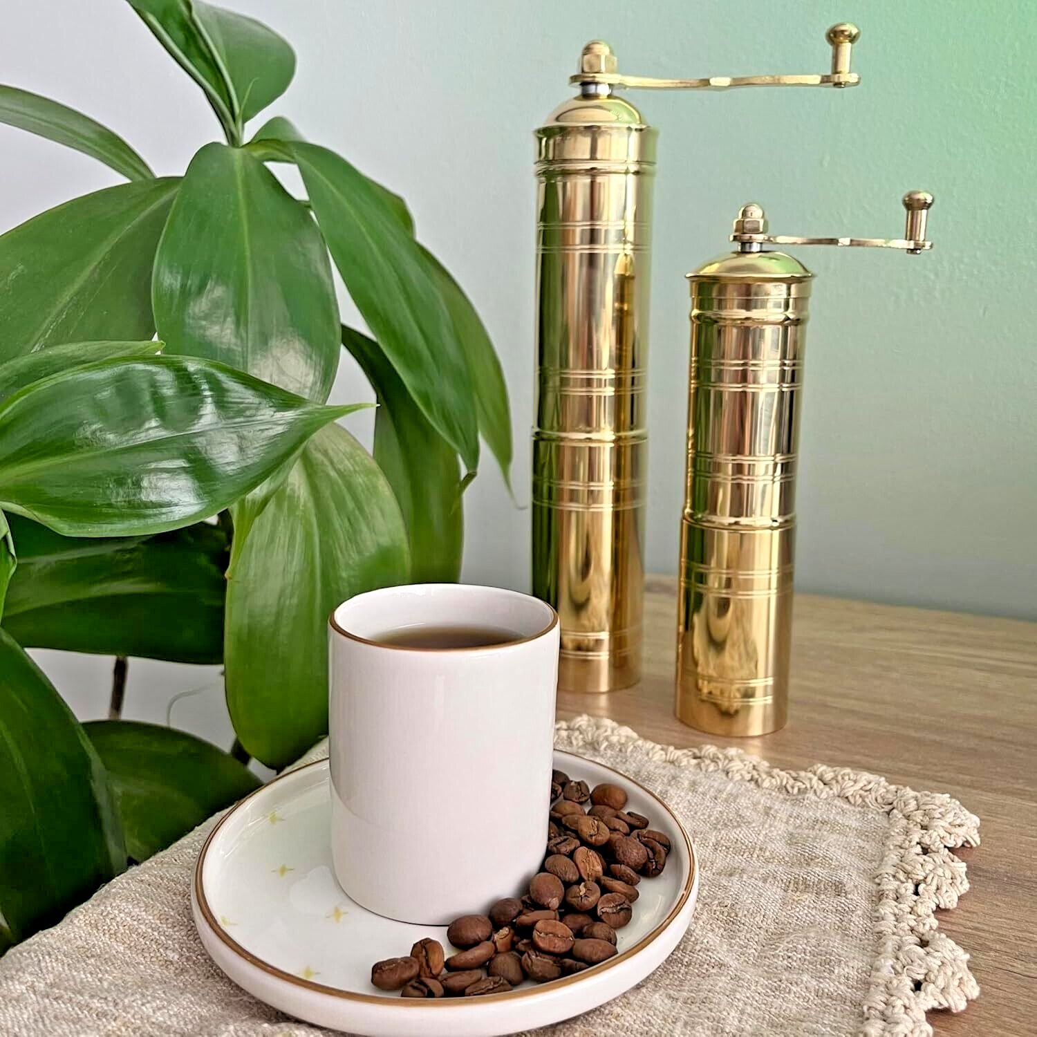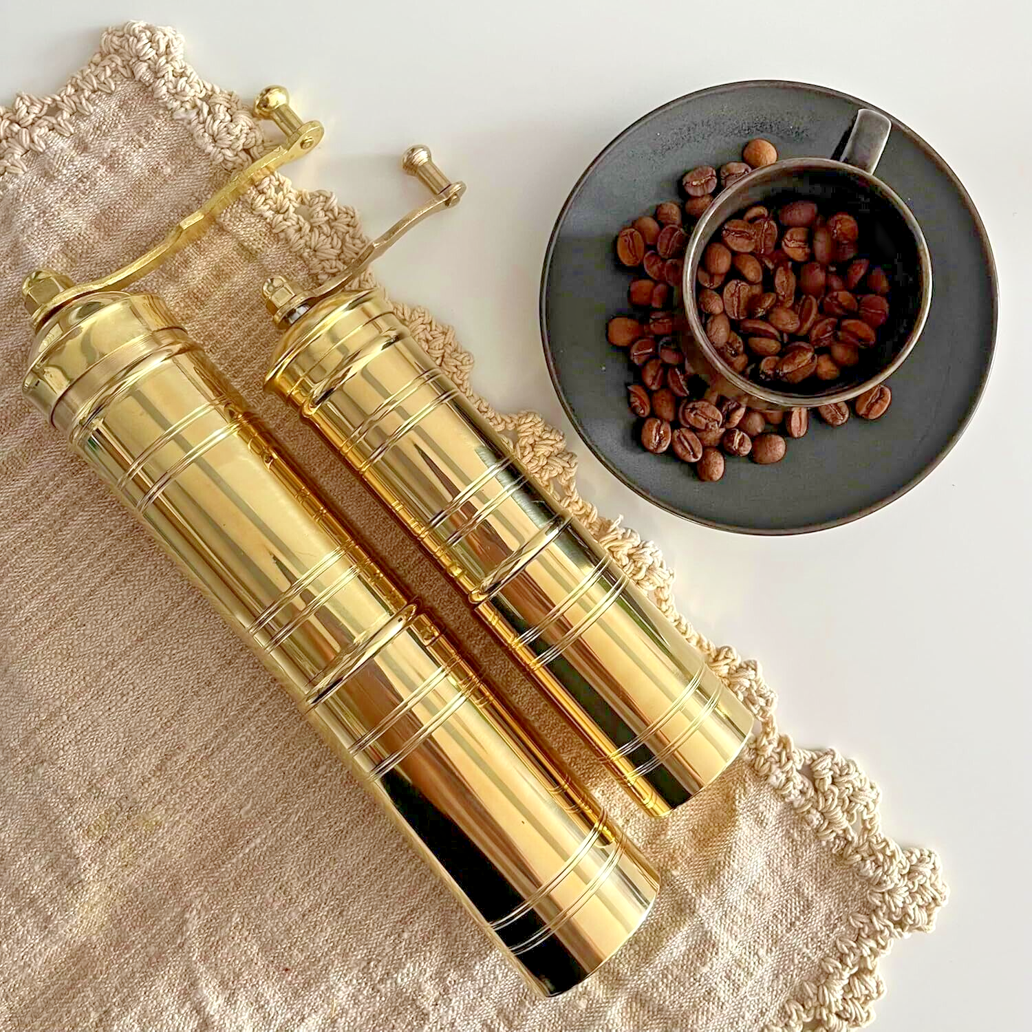 ? Introducing our meticulously crafted brass coffee grinder set, a timeless addition to your coffee ritual, blending vintage aesthetics with modern functionality.