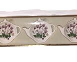 This set of 3 Botanic Garden Portmeirion CYCLAMEN spoon rests/tea bag holders features a beautiful purple cyclamen flower pattern in a round small porcelain teapot shaped ceramic design. With a contemporary style and original brand from Portmeirion, these spoon rests are perfect for all occasions and add a touch of elegance to any kitchen or dining table. The set includes 3 items, each measuring 4.5" in length and 3.5" in height, making them a practical and stylish addition to your kitchen tools and gadgets collection.