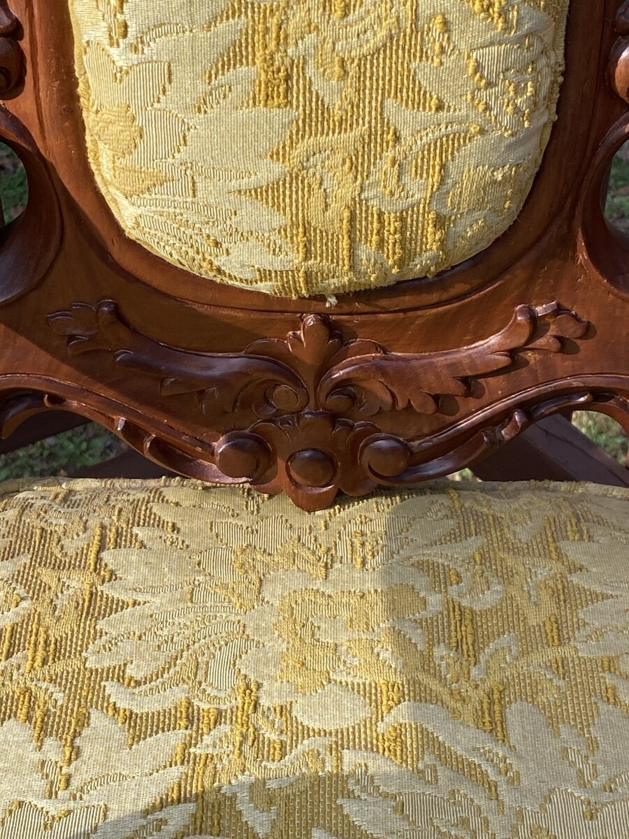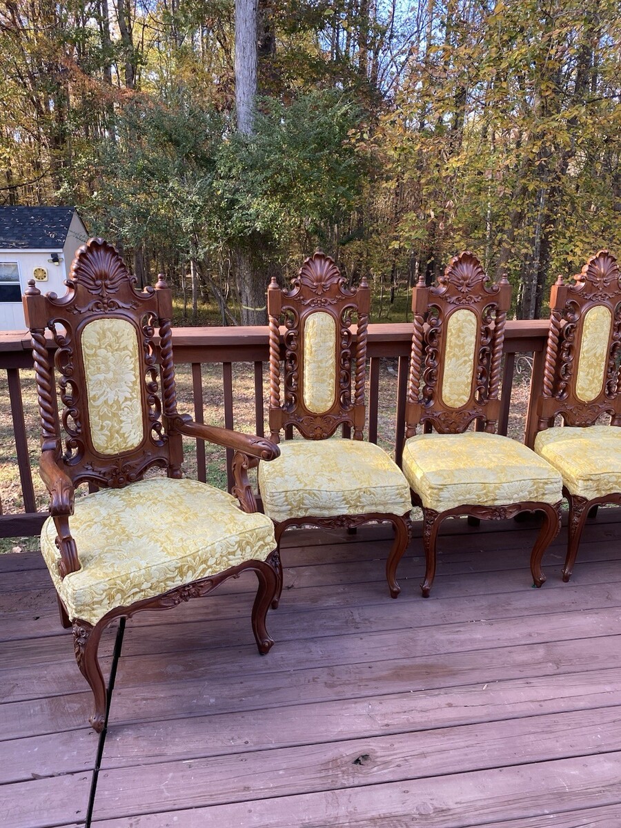 Offered is this beautiful Set of Dinning Room Chairs. The set consists of 2 arm chairs and 4 side chairs. Each is highly carved in the Louis XIII Style and are covered in an older brocade material from mid century. The chairs are strong , sturdy and heavy and we have found no significant damage or repairs with some antique or vintage wear commensurate with age. The seats are somewhat soft and should probably have the springs retied when recovered. The captains chairs measure 50 1/2" tall with the seats being 19" high by 20" wide and 19" deep. The side chairs are 48" tall with all other measurements being about the same. This is a lovely substantial set with beautiful lines and a wonderful appearance.