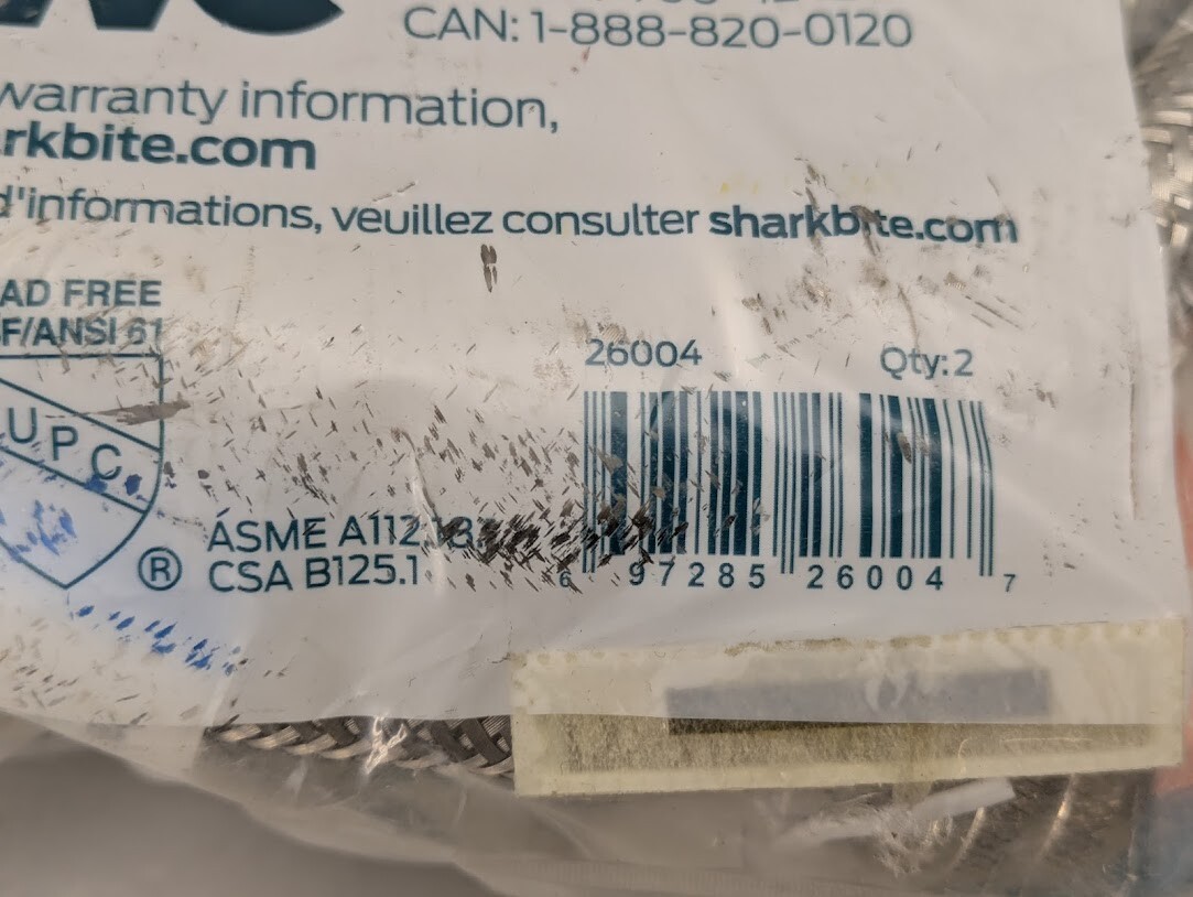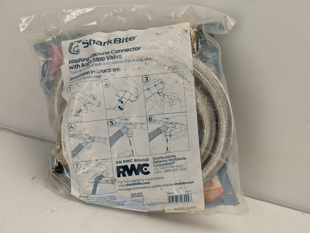 The SharkBite Washing Machine Connector with Angle Stop Valve has everything you need to install water supply and connections directly to washing machine in one step. The 5 ft. stainless steel hose is factory installed to the 1/2 in. stop valve the other end has standard 3/4 FHT. connections directly to the washing machine. The Trusted Quality Stainless Steel Lines by FLUIDMASTER and the SharkBite connections ensure quick set up and long-lasting durability. The kit includes a 2 pack of 60 in. (5 ft.) of stainless-steel supply line connected to a SharkBite 1/2 FHT. washing machine valve. Connect the valve to either the hot or cold-water supply and the attach the 3/4 in. supply line directly to the washing machine. The easy to mount valve features drop ear mounting tabs for stability and precise installation. The SharkBite push-to-connect end allows you to simply push on to Copper, PEX, CPVC or PE-RT without solder, clamps, unions or glue. Just insert the pipe and the stainless-steel teeth bite down and grip tight, while a specially formulated O-ring compresses to create a perfect seal. Disassembly is just as fast using the simple disconnect tool so fittings and valves can be easily changed and reused. They can even be rotated after assembly for easier installation in those tight spaces where your washing machine may be located.