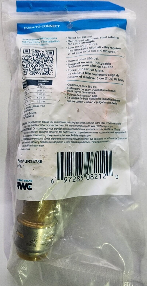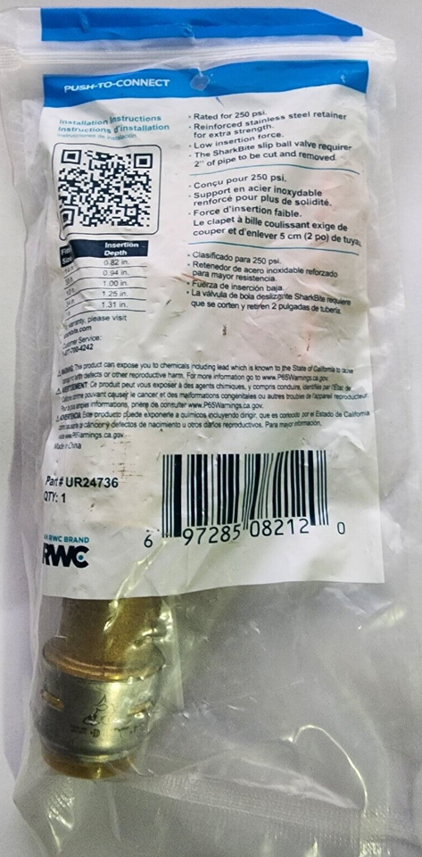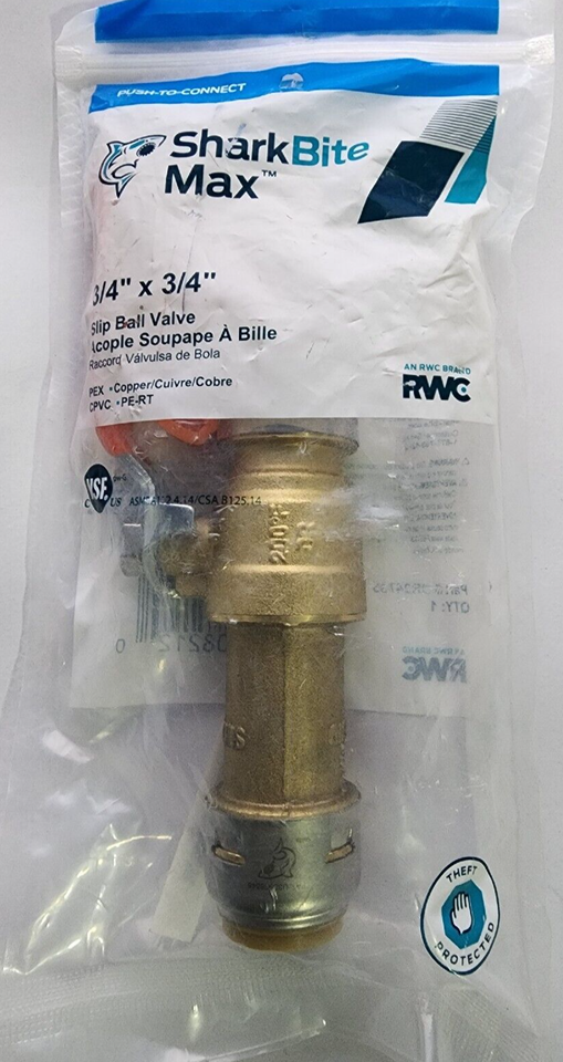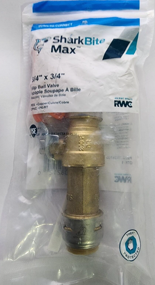 You are Buying a Brand New And Factory Sealed SharkBite Max 3/4" X 3/4" Push-To-Connect Brass Slip Ball Valve Model #24736LF.... Removing the valve is just as fast using a disconnect tool so the valve can be easily changed or reused. Designed with stainless steel gripping teeth for a secure connection, a chlorine-resistant O-ring for a long-lasting seal, and backed by a 25-year warranty. Compatible with PEX, copper, CPVC, PE-RT, and HDPE pipe