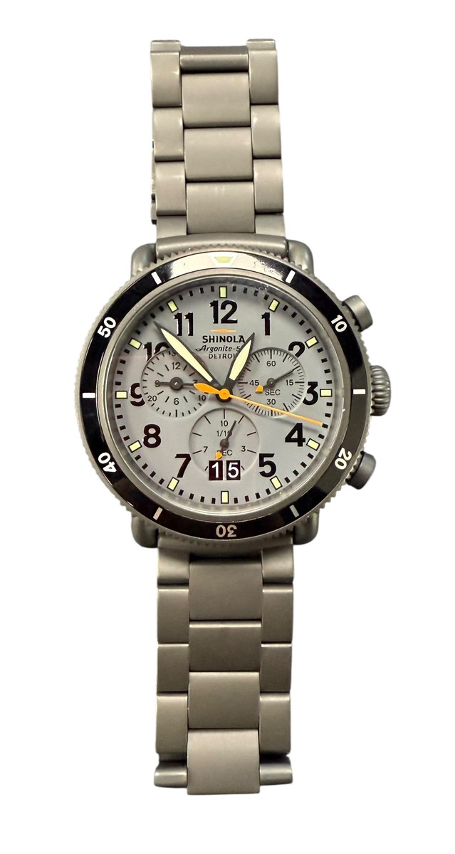 Type: Wrist watchBrand: ShinolaModel number: S0100094Case width: 42mmWeight: 88.4Case Material: Stainless SteelBox included: noPaperwork included: noRunning: yesDial color: grayBand material: Stainless SteelBezel Material: Stainless SteelCondition:Used