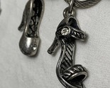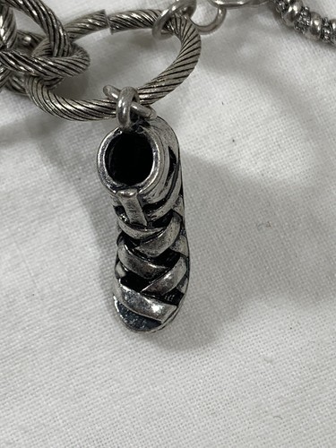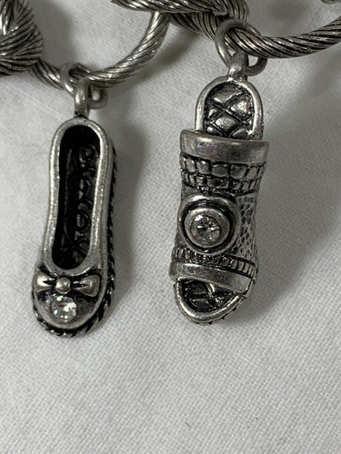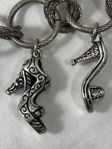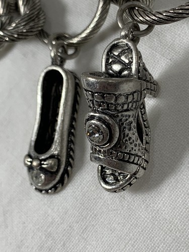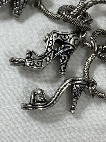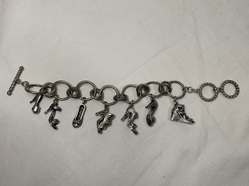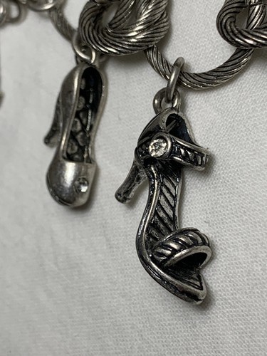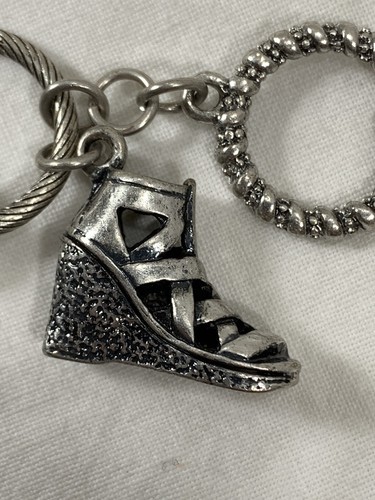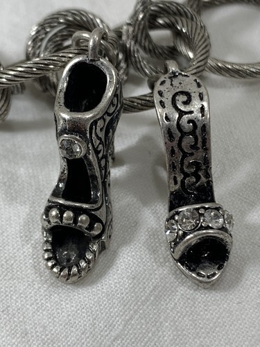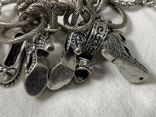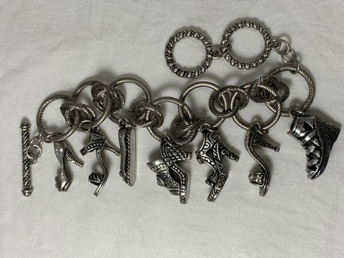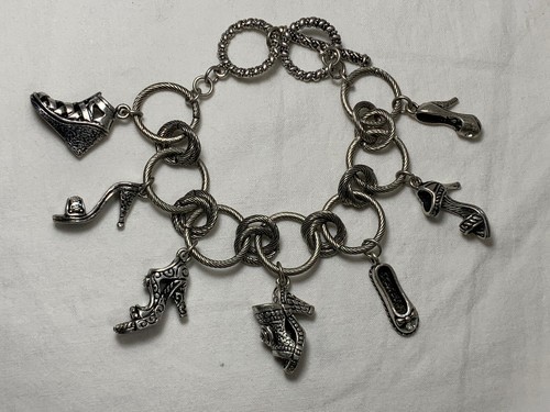 If you like shoes and have a ton, then you will love this silver toned charm bracelet. Measures approx 7.5" long, and is made of a silver tone metal, with a toggle clasp. Has 7 charms all different type dressy shoes of which 6 have a sparkly gemstones making them special. The gladiator does not have one. Would make for a great gift.