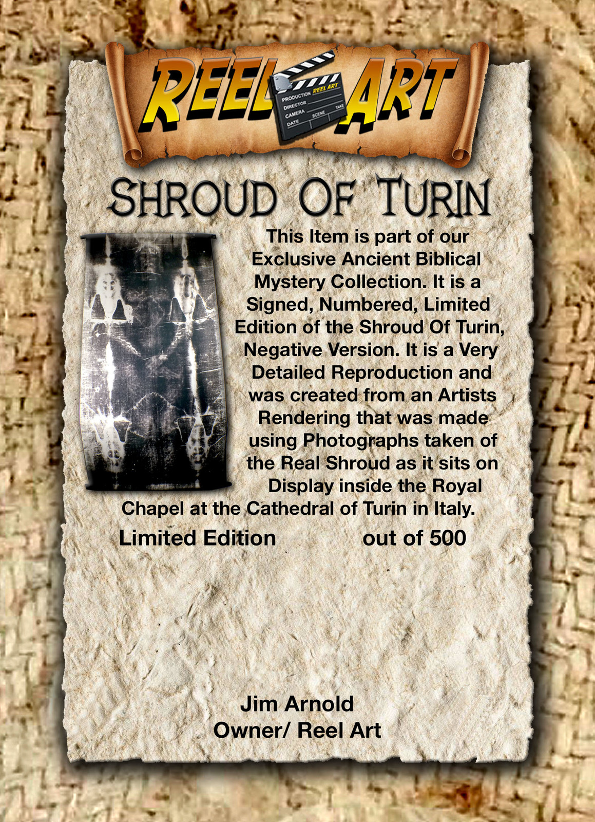The Shroud Of Turin is part of our Exclusive: Ancient Biblical Replica Collection. Each item is a Signed, Numbered, Limited Edition and Comes Complete with a Full Color, Professionally Printed, Certification Certificate. This is an Exact Replica of the Famous Shroud Of Turin, With a Large Image of Secondo Pia's Full Body of Christ Photo from 1898 Printed on its Surface. This Item is for the Negative Frontal Body Style Version.