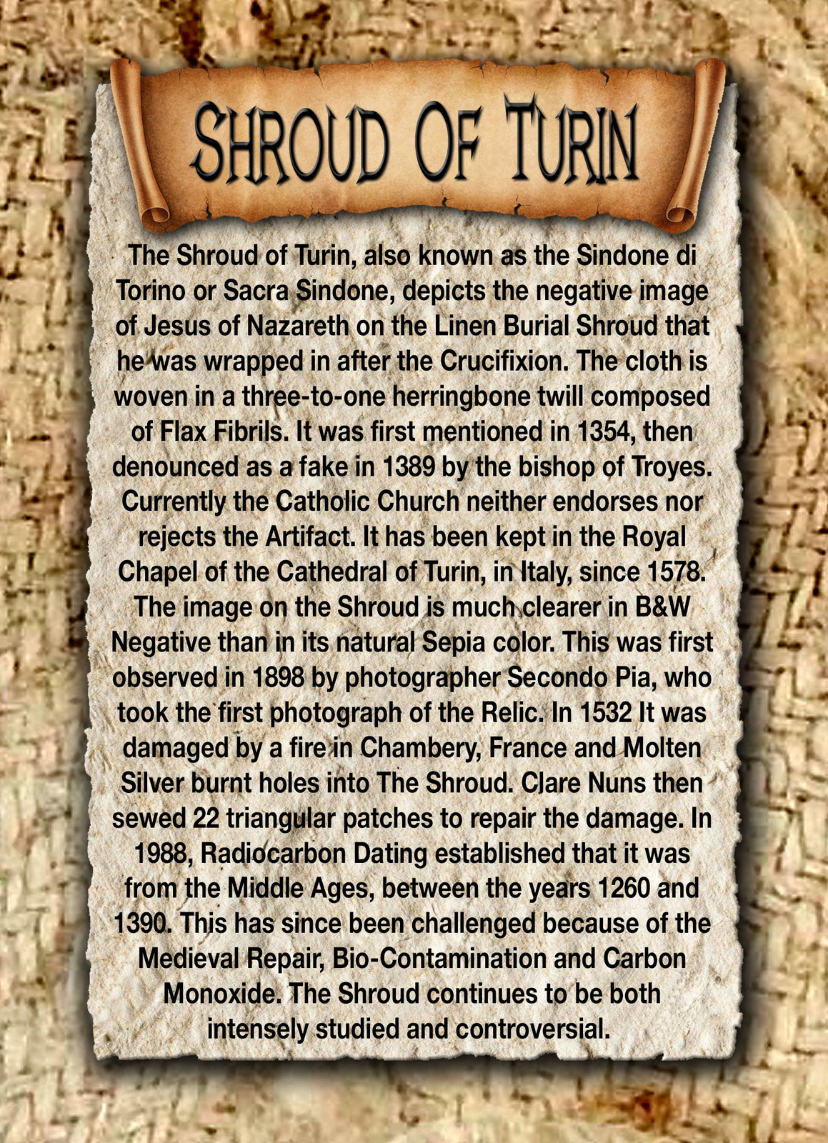 Included With the Shroud you will also get a Free Signed Copy of our Book; The Saga Of The Shroud. This is a $29.99 Value yours for Free. Our Book is 8.5 x 11 inches and over 145 pages with many Rare Pictures from Ancient Books. The Front Cover has a Full Color Close Up Image of the Real Shroud. The Back has a Close up Photo of the Secondo Pia Reliquary of his 1898 Photographs. The Book Delves into the Timeline of the Shroud before the 1349 Factual Timeline by using some New Information that has Come to Light Recently.