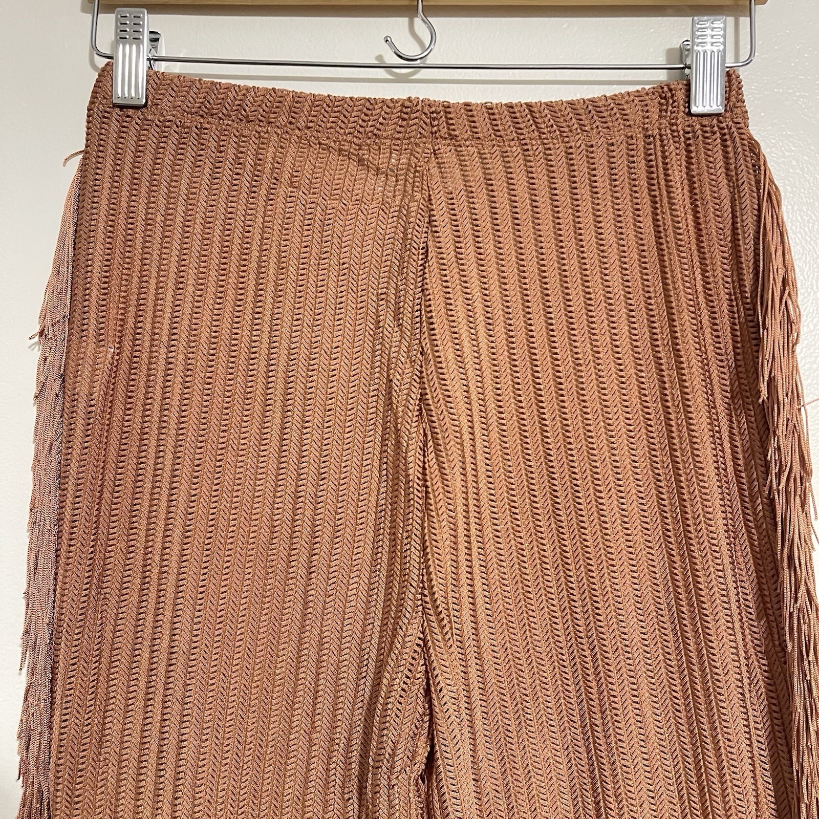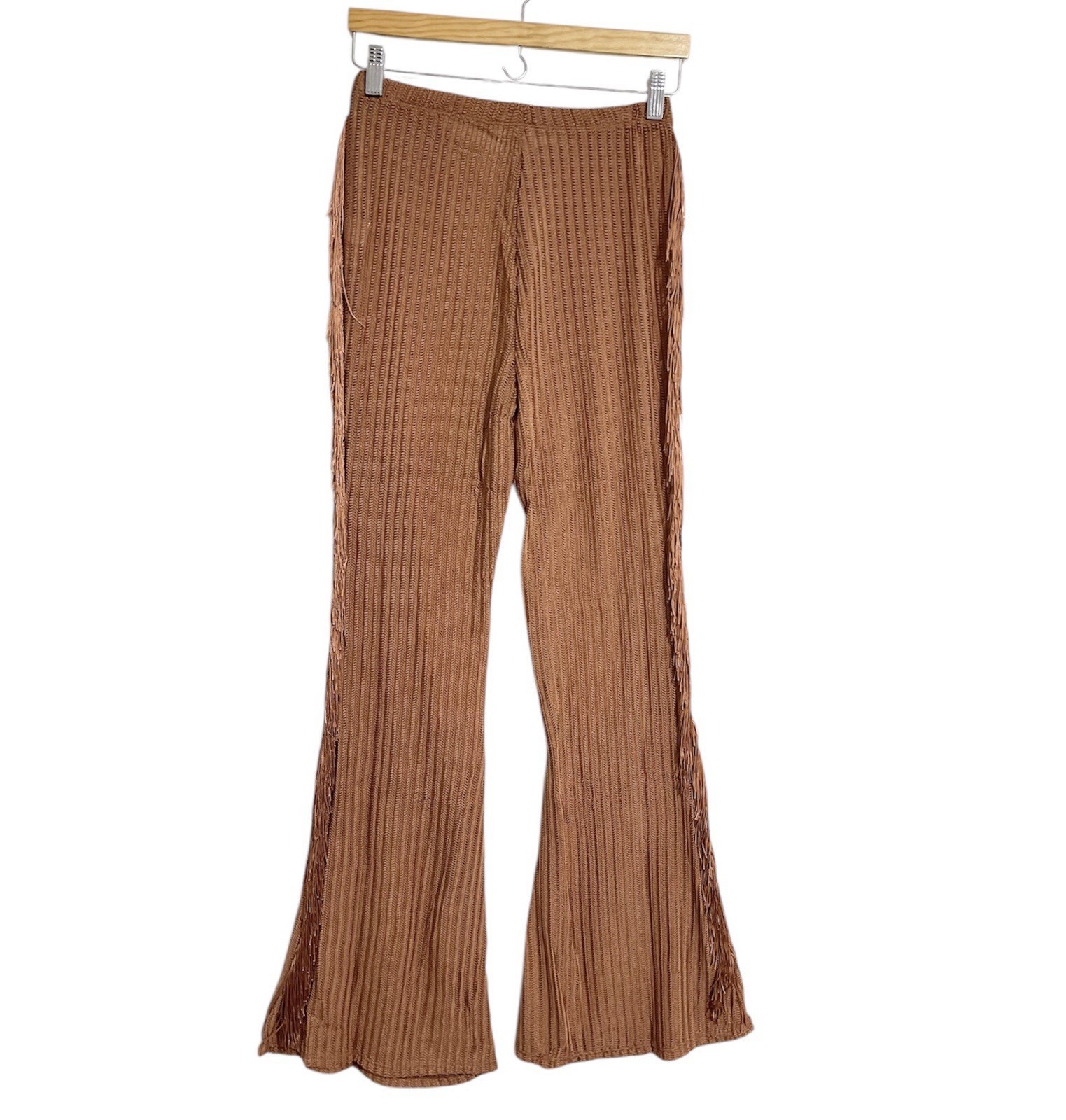 - Side Fringe Knit Flare Leg Pants Size L Caramel Brown Sheer Cowgirl Costume NWT