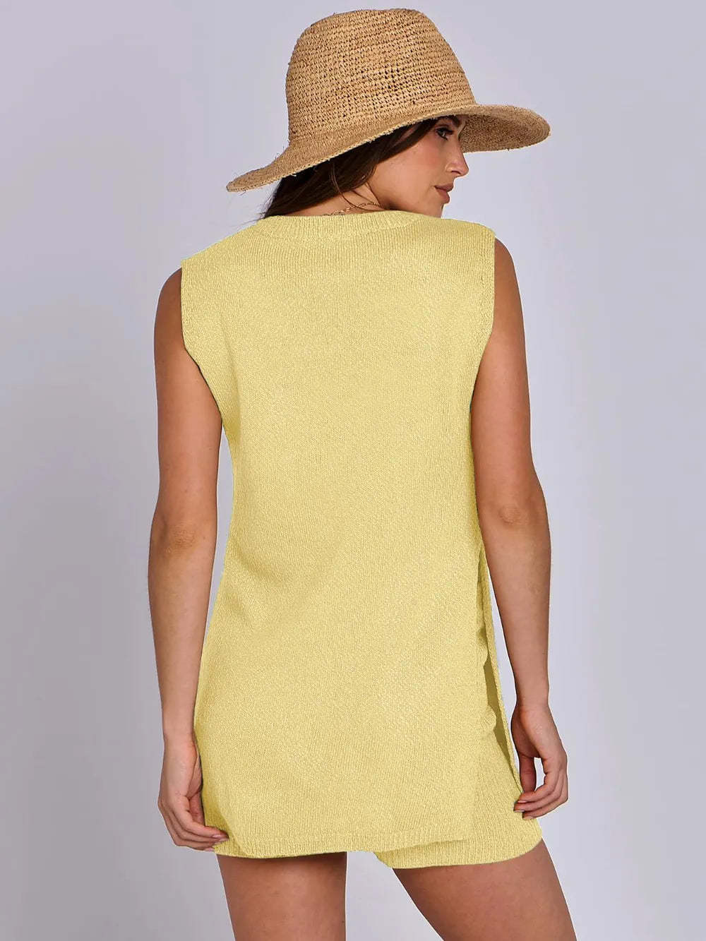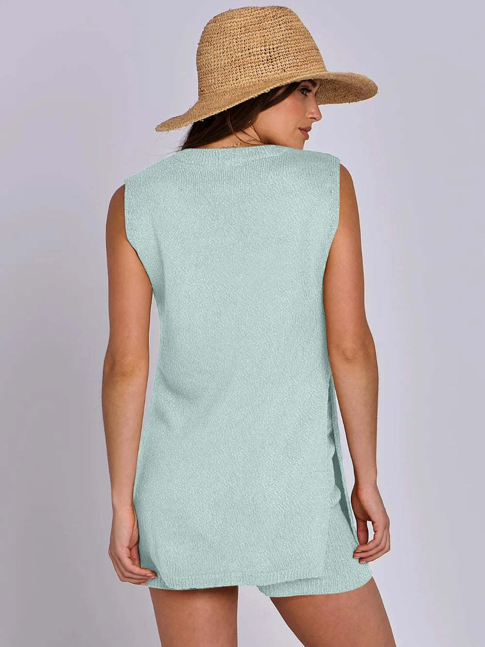 - Side Slit Round Neck Tank and Ribbed Shorts Sweater Set