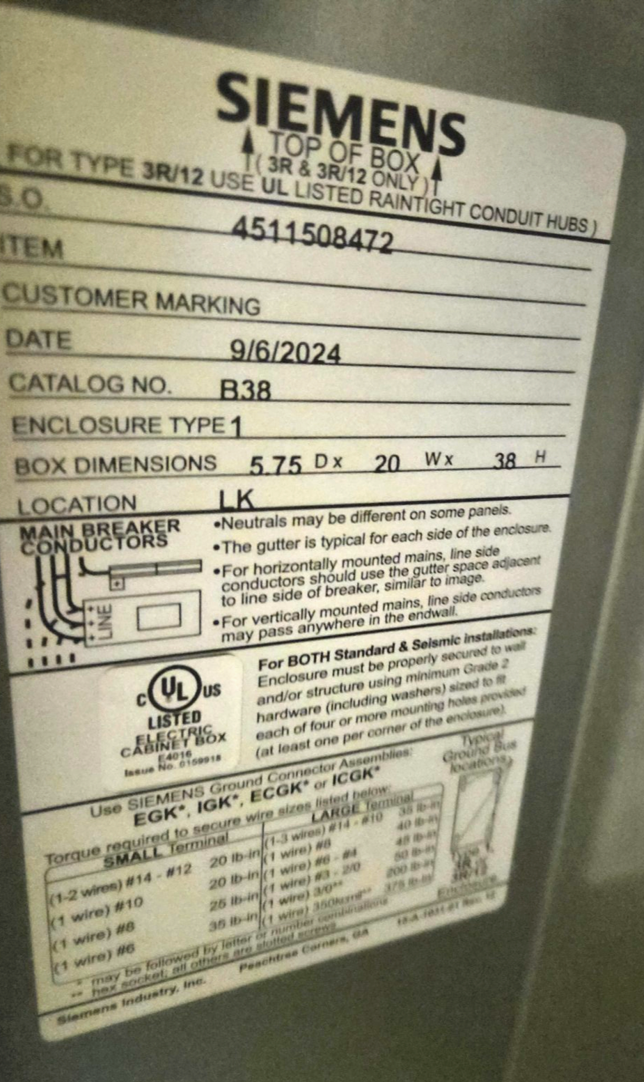 - Siemens B38 20 x 5.75 x 38 Inch NEMA 1 Panelboard Box
