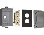 Complete kit includes universal cover, one-gang box with three 1/2-in holes, duplex receptacle, closure plugs, hardware and gasket