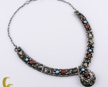 Signé H Argent Sterling Panneau Collier W/Turquoise & Corail Pierres