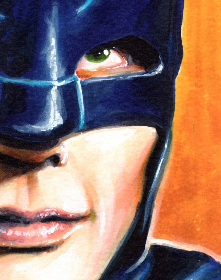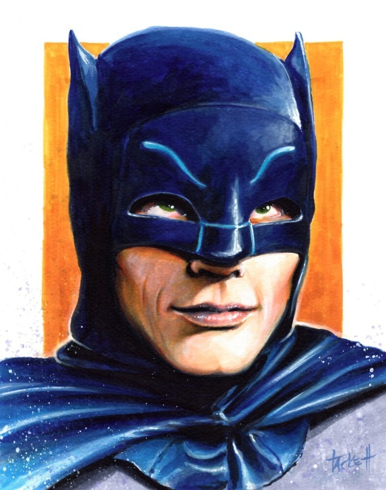 Step into the Technicolor world of Gotham City with this stunning portrait of Adam West as Batman from the beloved 1966 TV series. Crafted by award-winning artist Billy Tackett, this unique artwork showcases the legendary Caped Crusader in all his heroic glory. Measuring 11"x14", this portrait is meticulously painted with a blend of markers, acrylics, and colored pencils on high-quality watercolor paper.
