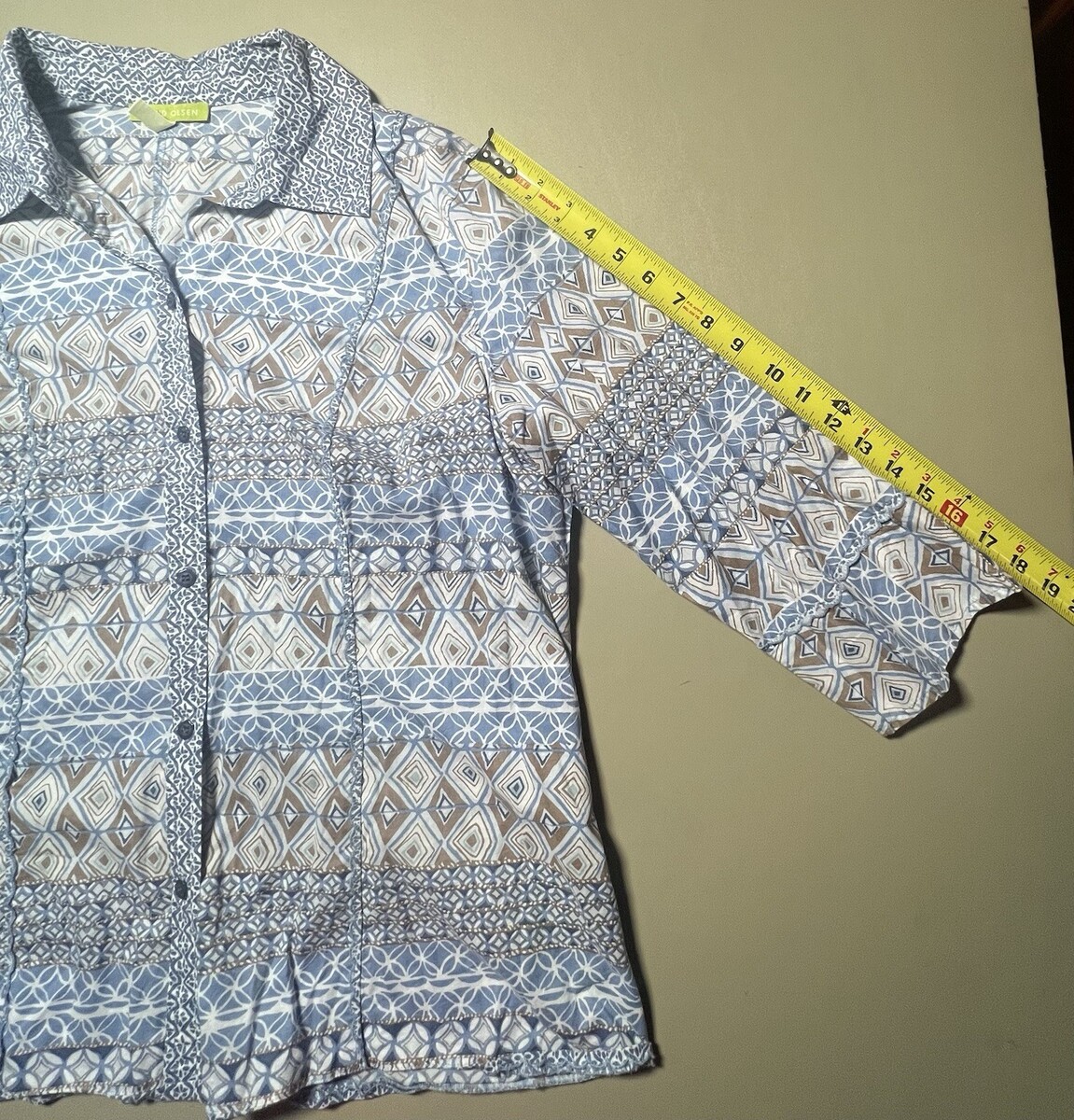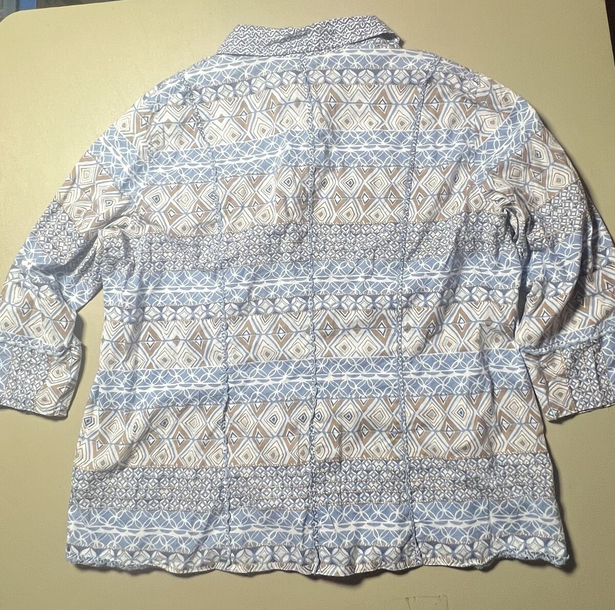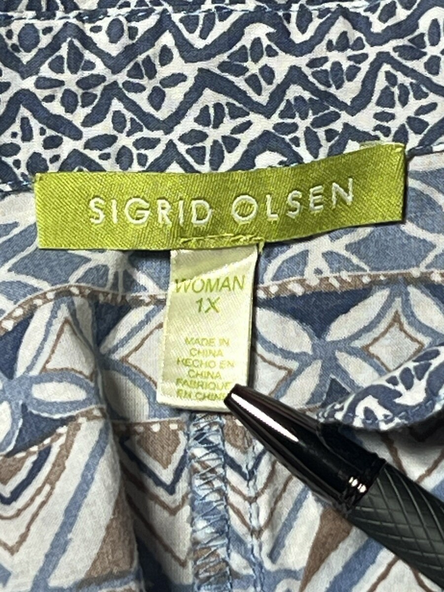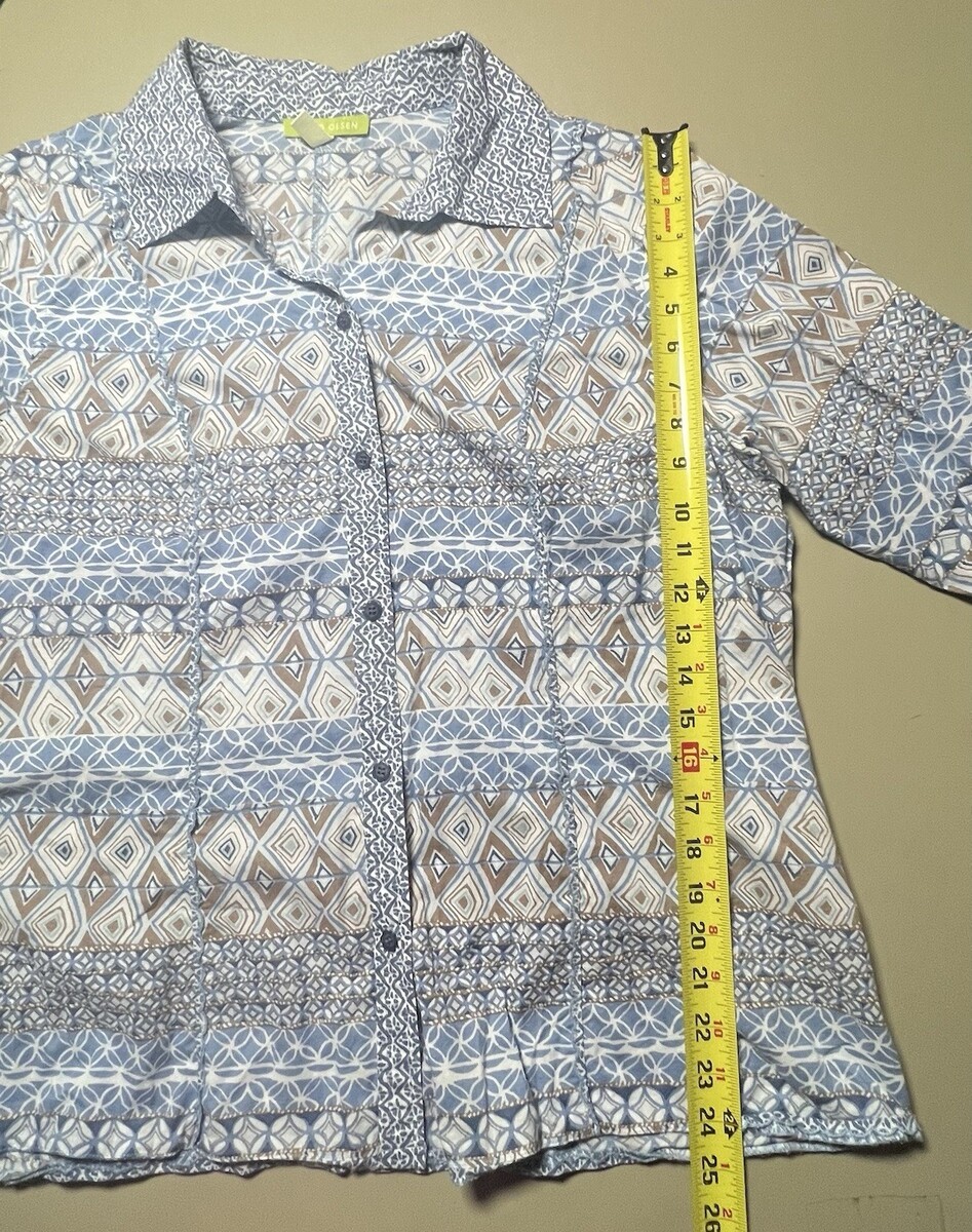 Sigrid Olsen Button Up Top Women’s 1X Blue White Tan Geometric Design